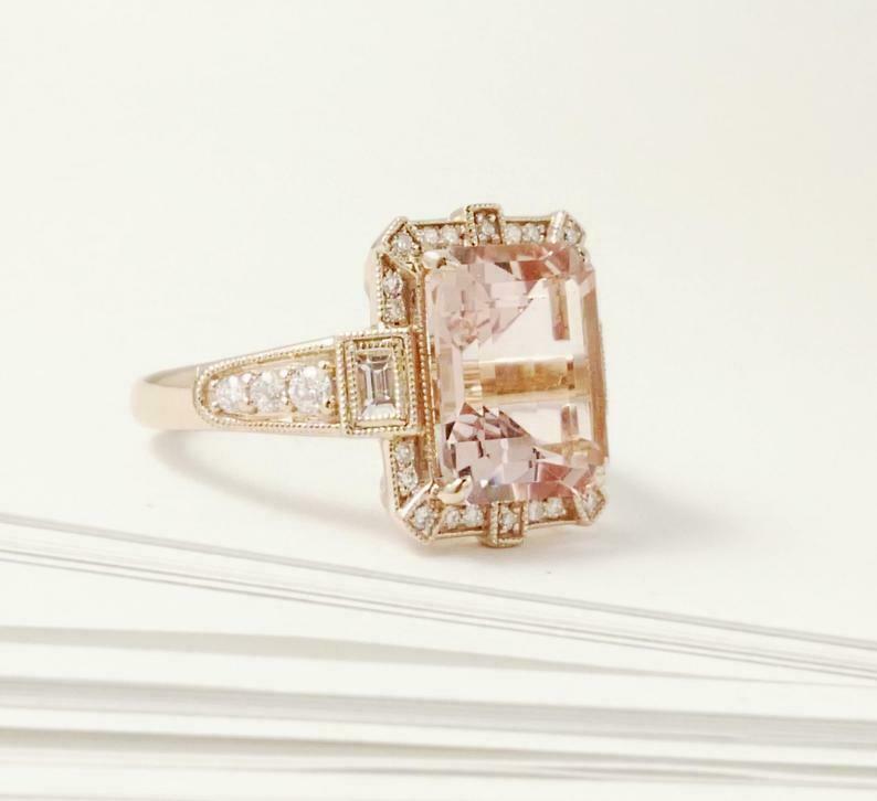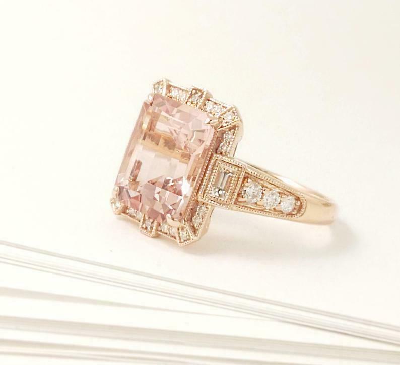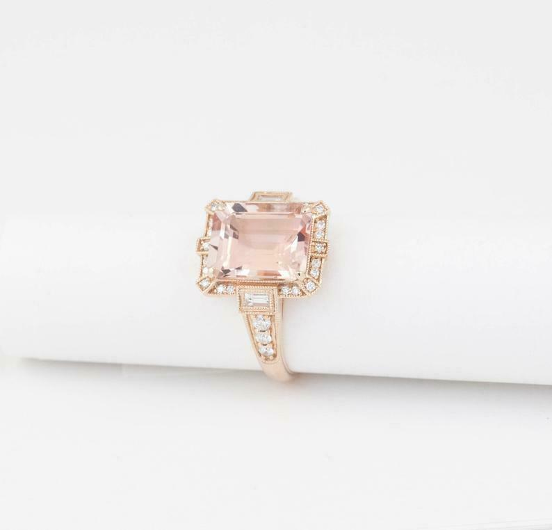 2.3ct Engagement Ring Emerald Cut Peach Morganite Art Deco 14k Rose Gold Finish