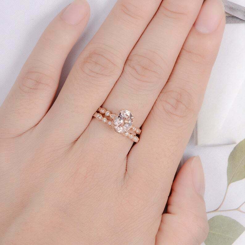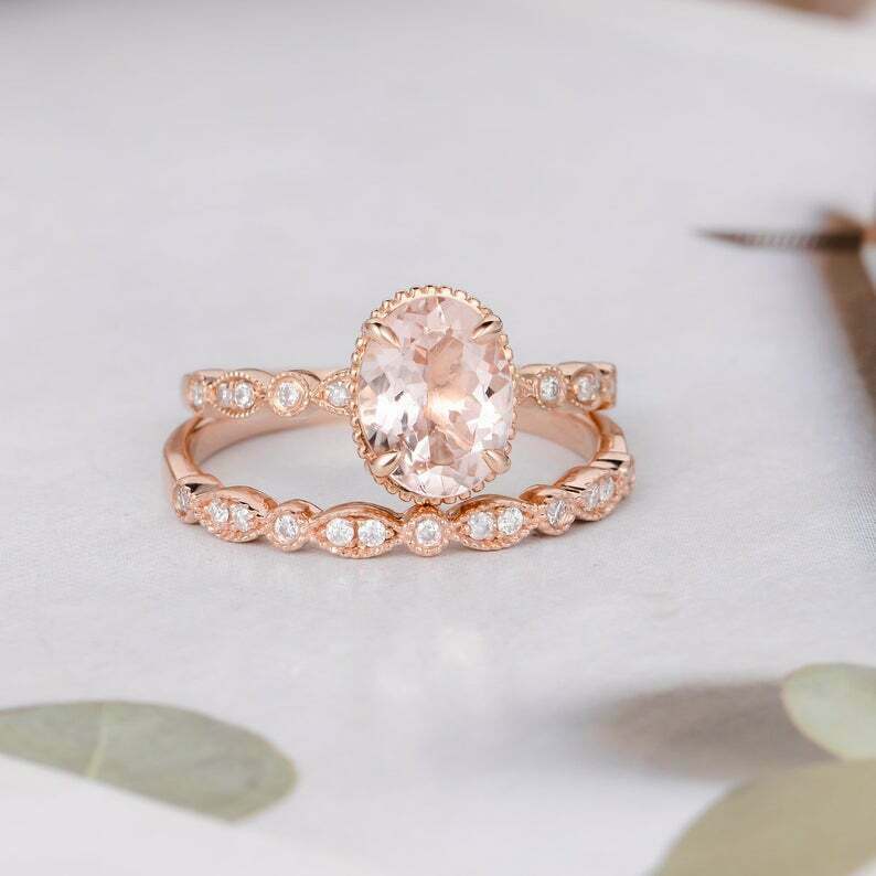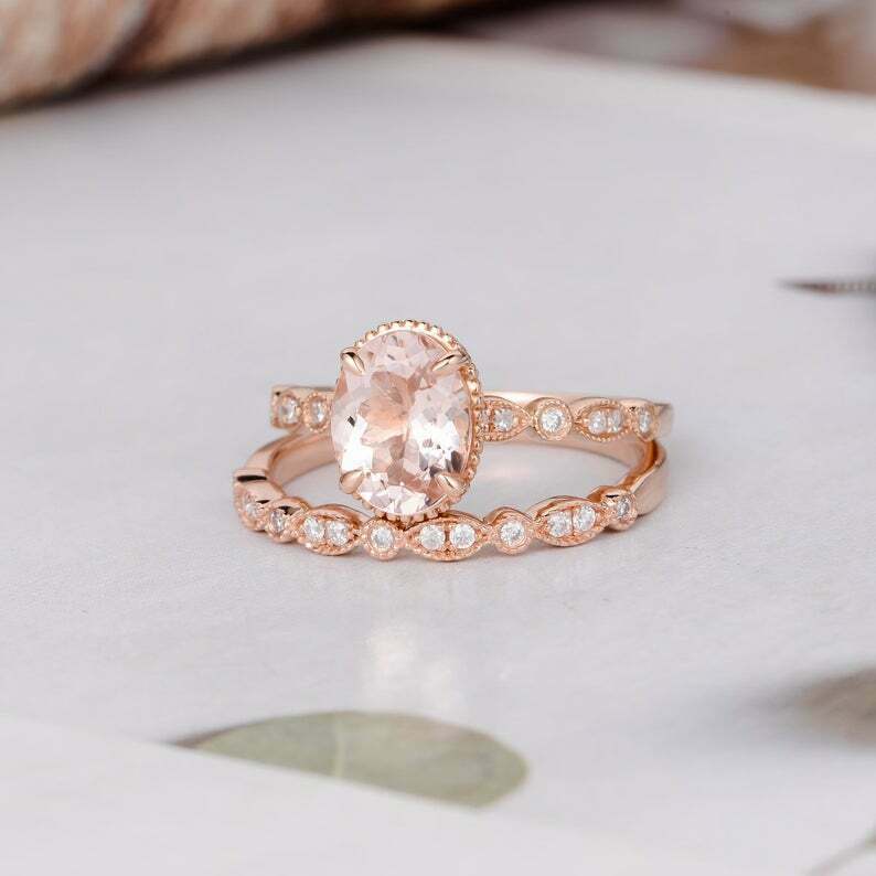 2.3ct Oval Cut Morganite Engagement Ring Milgrain Bridal Set 14k Rose Gold Over
