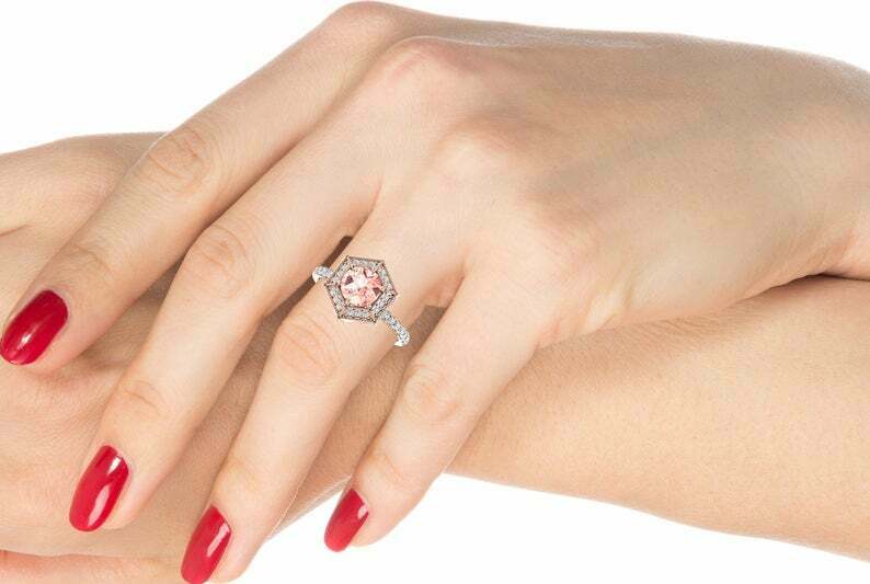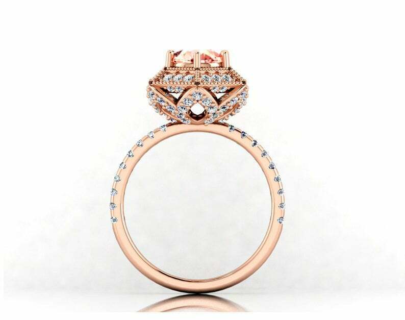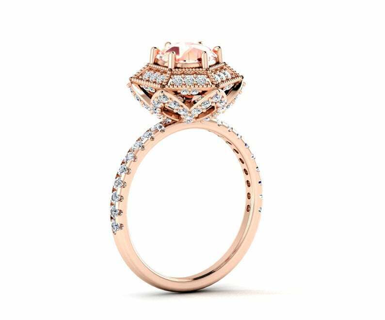 2.3ct Round Cut Peach Morganite Halo Solitaire with Accents Ring 14k Rose Gold Finish
