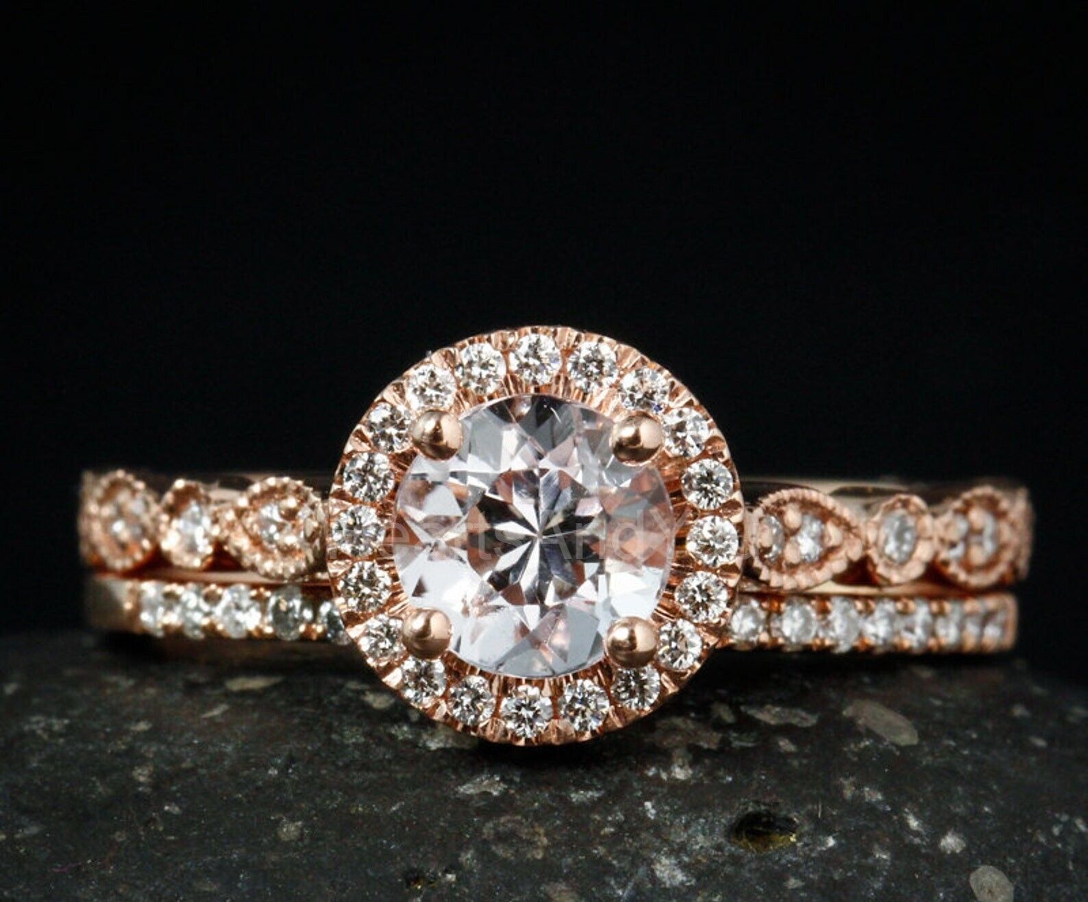 2.3ct Round Cut Simulated Morganite Milgrain Halo Ring Set 14k Rose Gold Plated