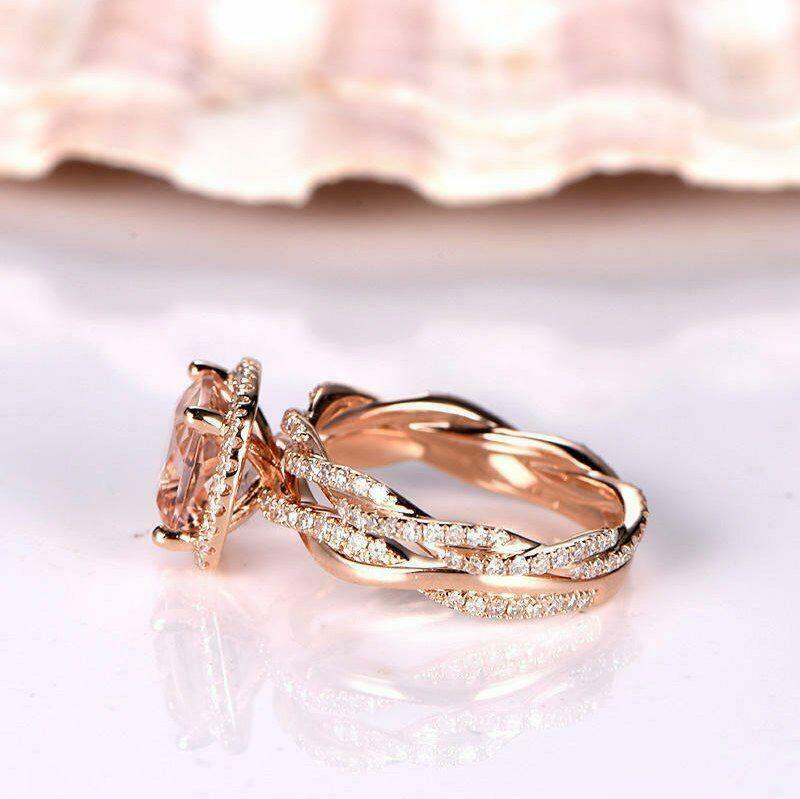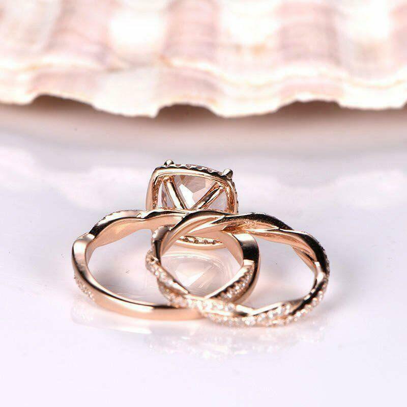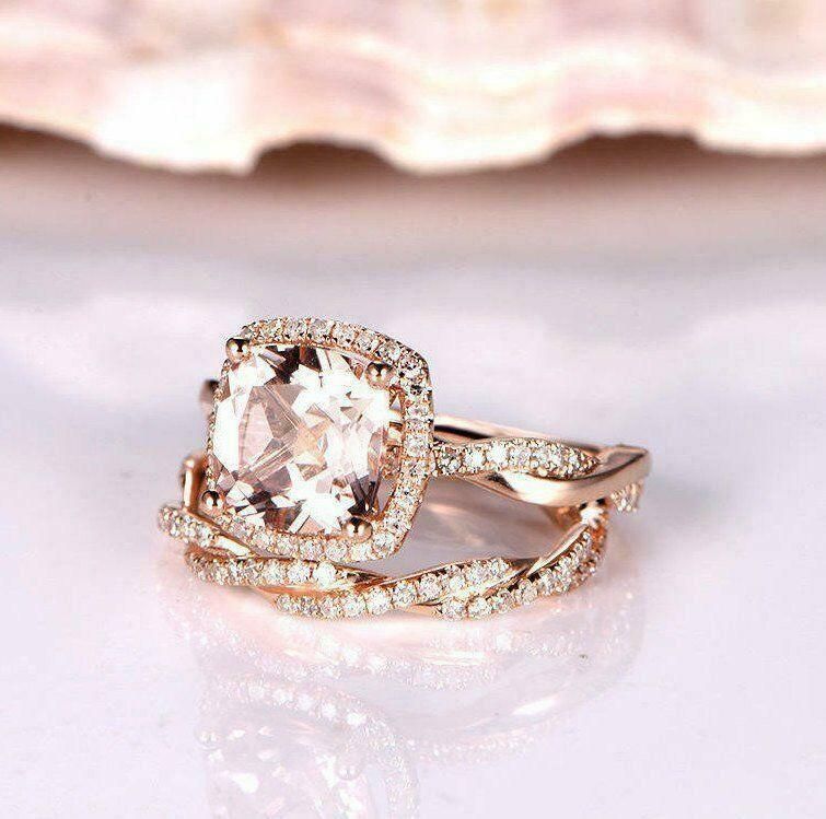 2.5ct Cushion Cut Peach Morganite Bridal Set Engagement Ring 18k Rose Gold Over