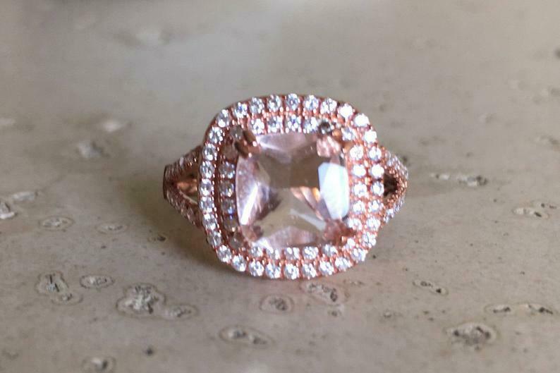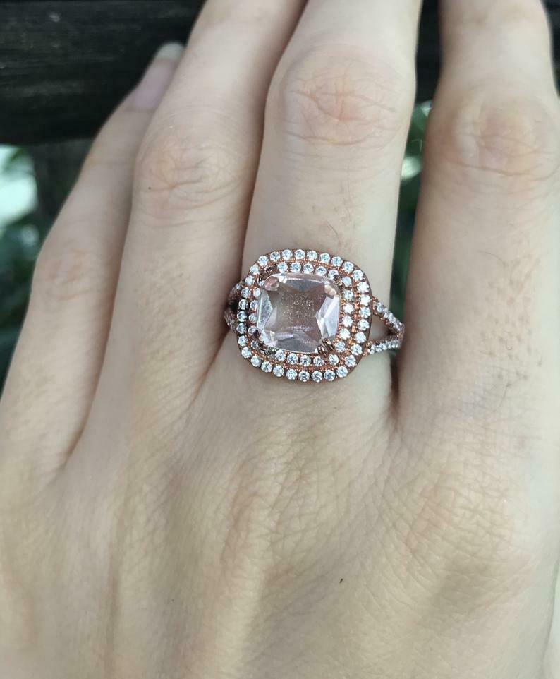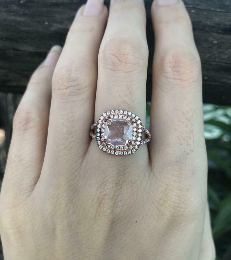 2.5ct Cushion Morganite Engagement Ring Dual Halo Split Shank 14k Rose Gold Over