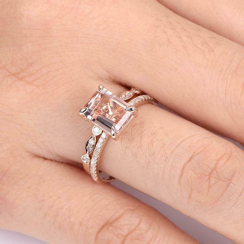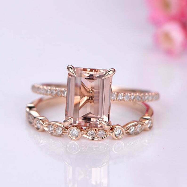 2.5ct Emerald Cut Peach Morganite Engagement Ring Bridal Set 14k RoseGold Finish