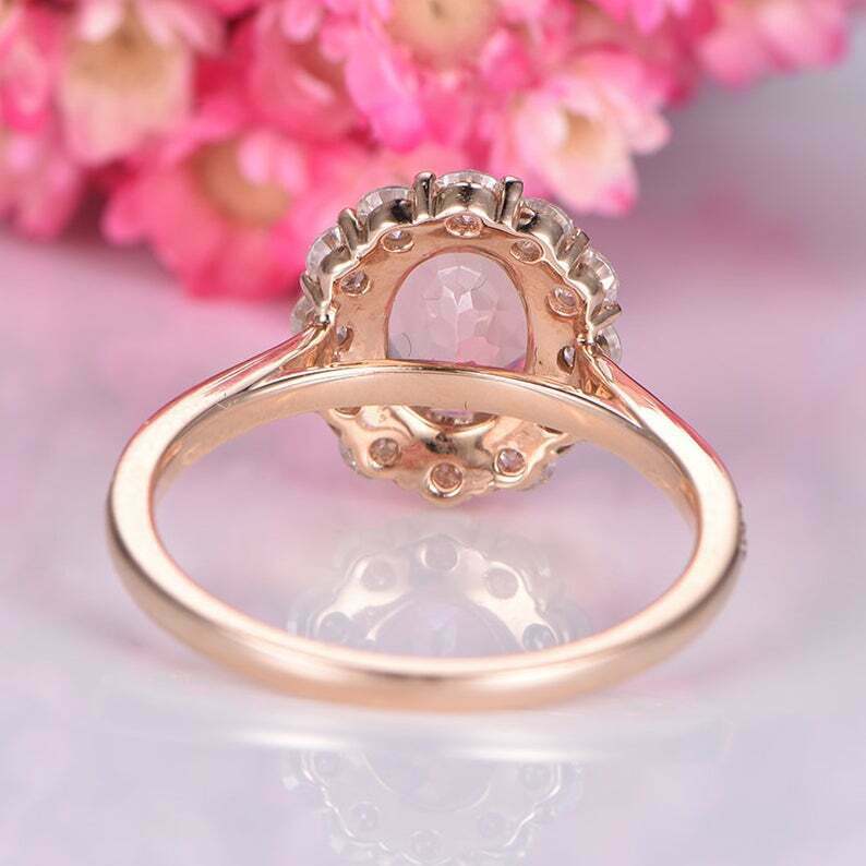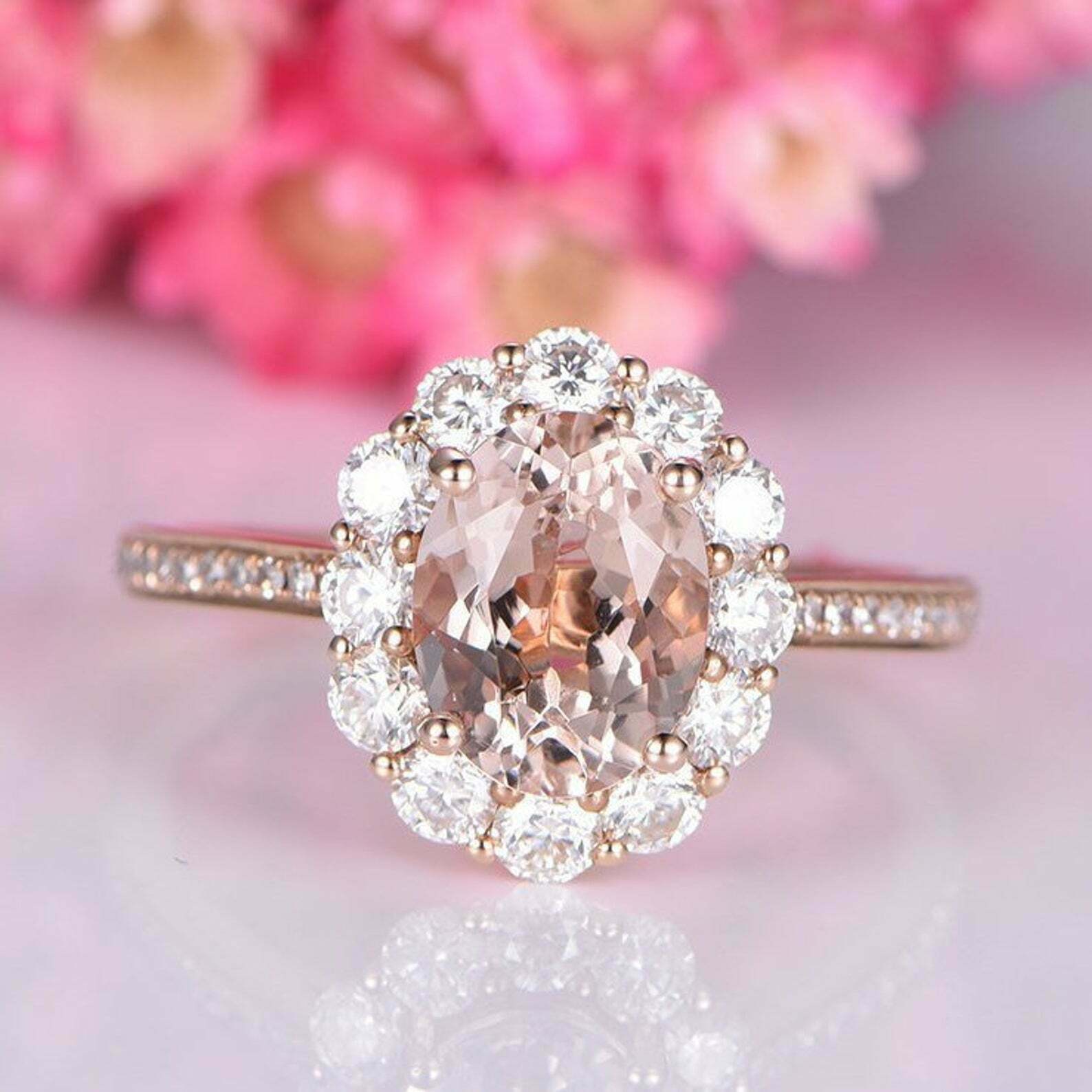 2.5ct Oval Cut Peach Morganite Engagement Ring Halo Floral 14k Rose Gold Finish