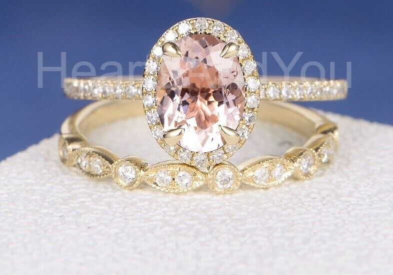 2.5ct Oval Cut Simulated Morganite Milgrain Halo Bridal Set 14k Rose Gold Plated