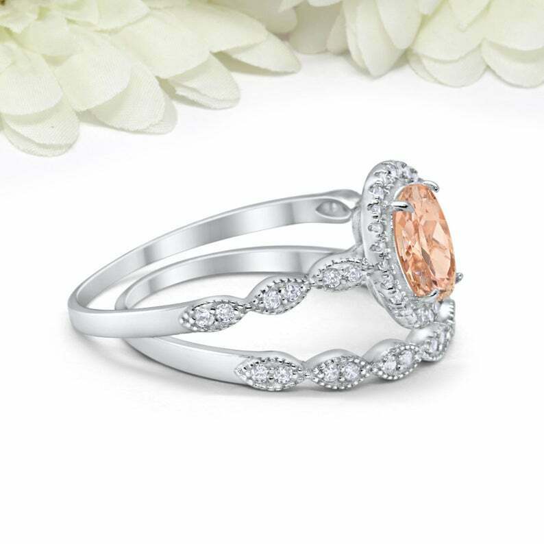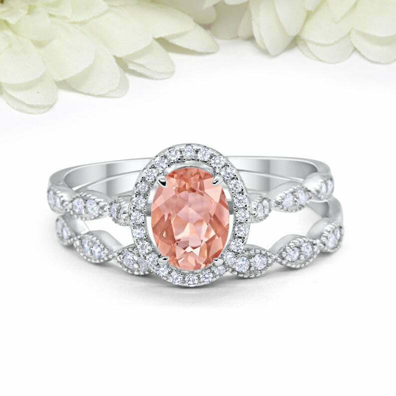 2.5ct Oval Cut Peach Morganite Engagement Ring Bridal Set Halo 14k White Gold Finish