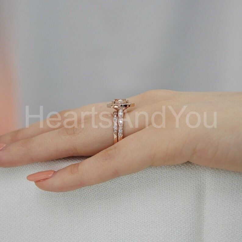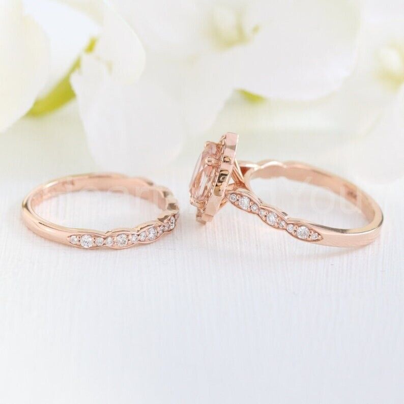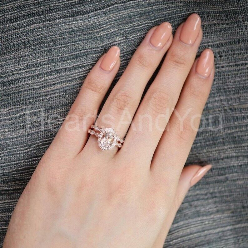 2.5ct Oval Cut Simulated Peach Morganite Halo Half Eternity Bridal Set 14k Rose Gold Plated