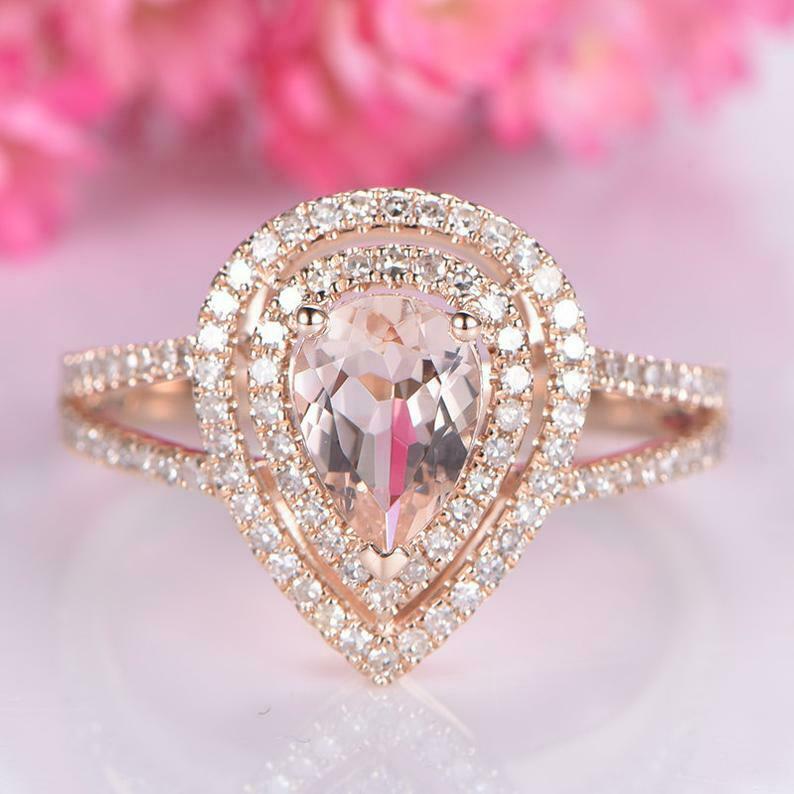 2.6ct Pear Cut Morganite Engagement Ring Dual Halo Split Shank 14k Rose Gold Over
