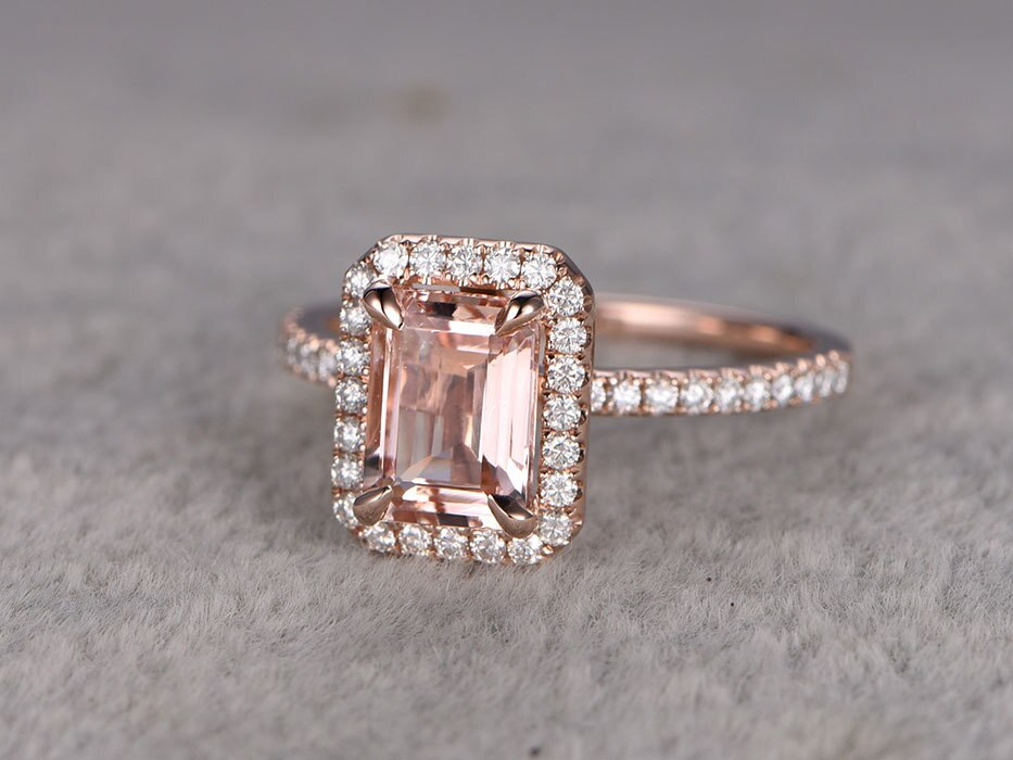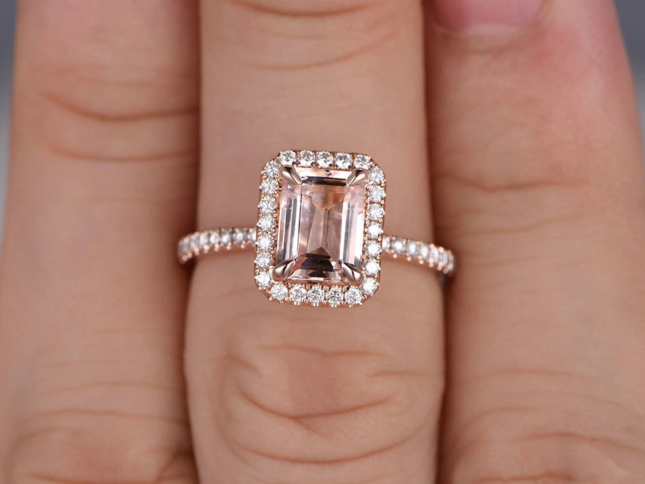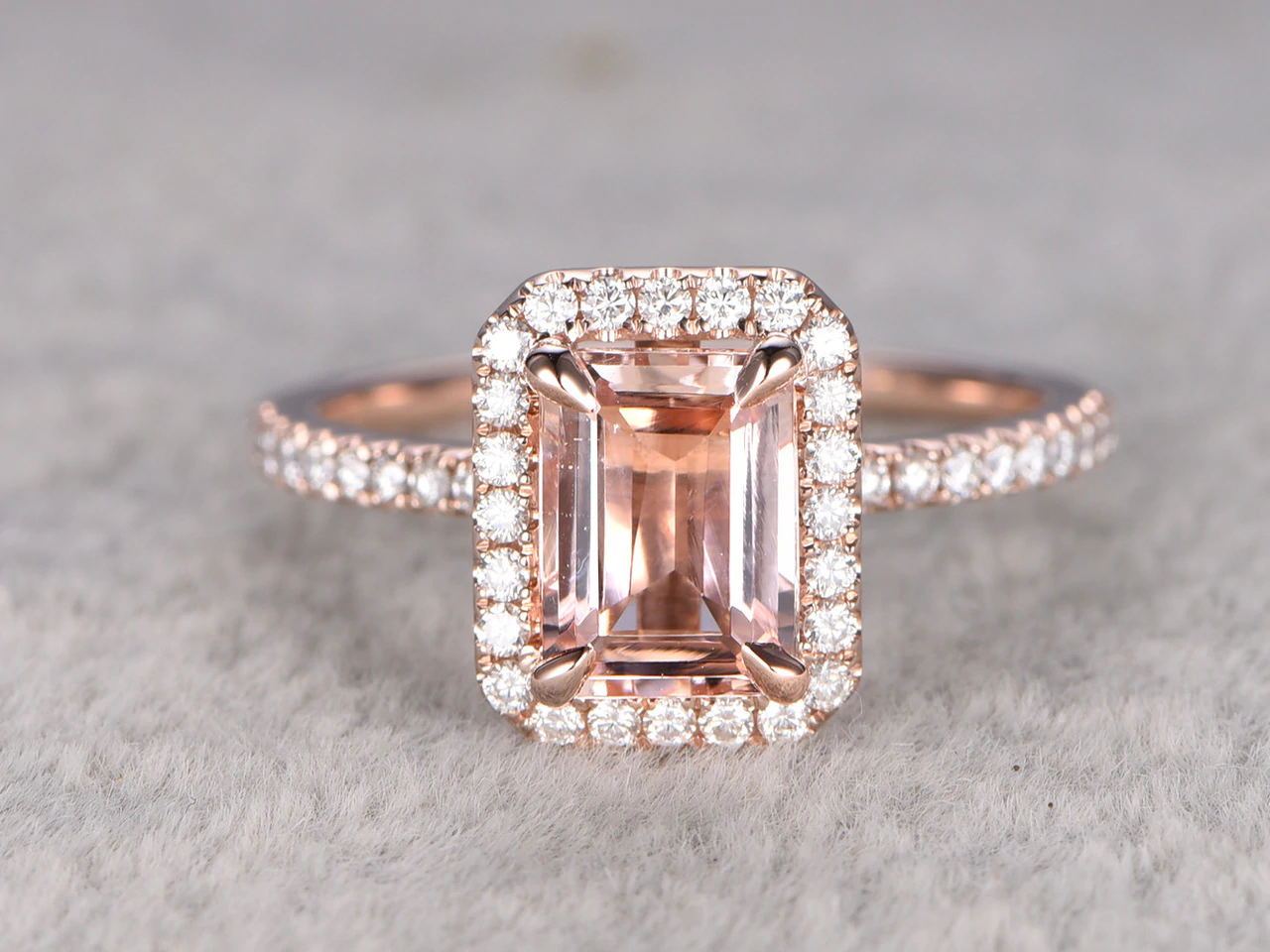 2.8ct Emerald Cut Peach Morganite Halo Women Solitaire Ring 14k Rose Gold Finish