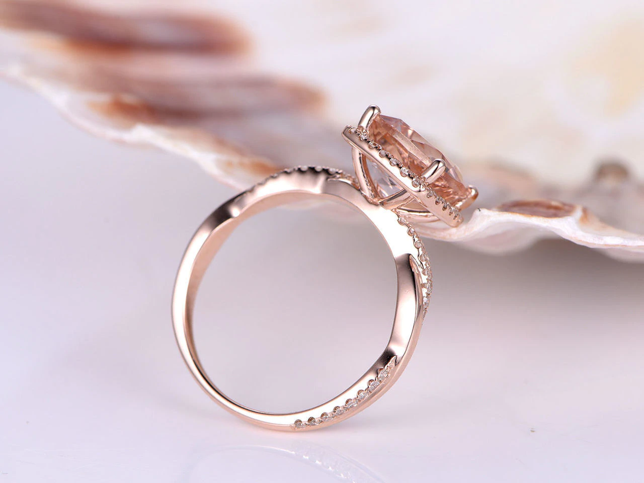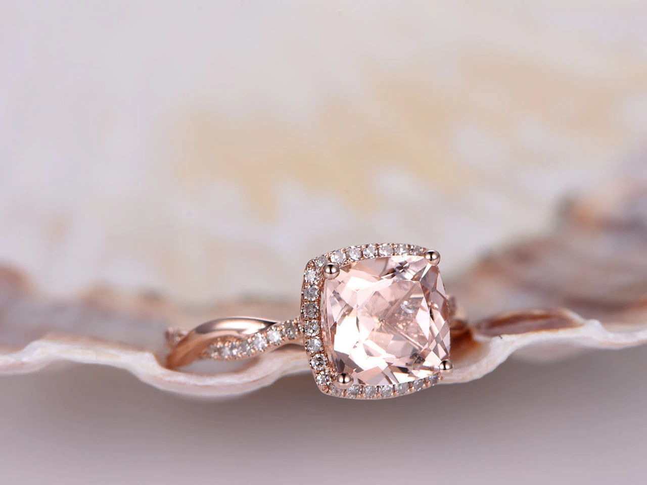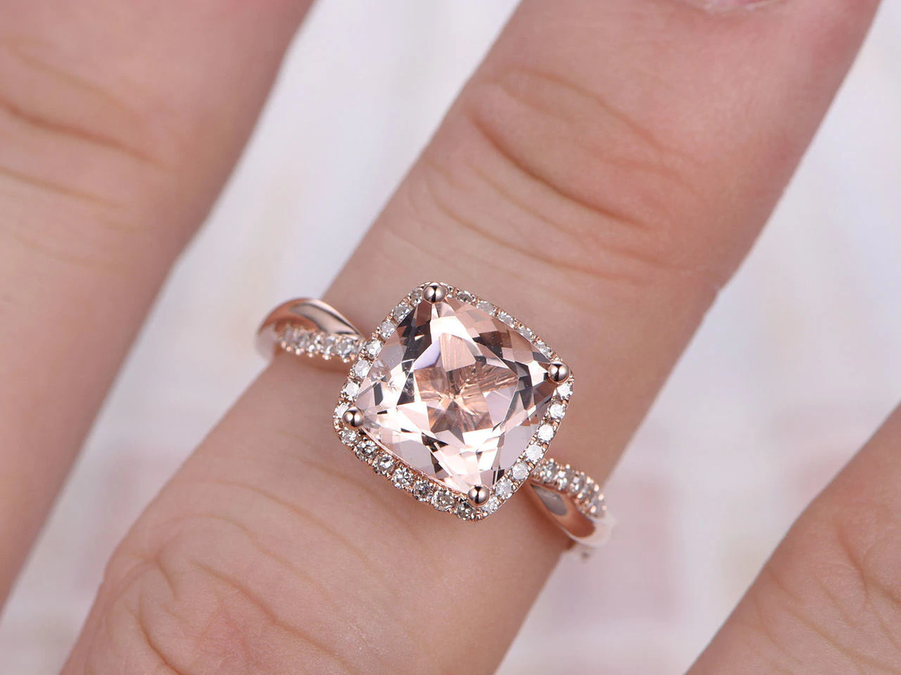 2ct Cushion Cut Morganite Engagement Ring Twist Diamond Halo 14k Rose Gold Over