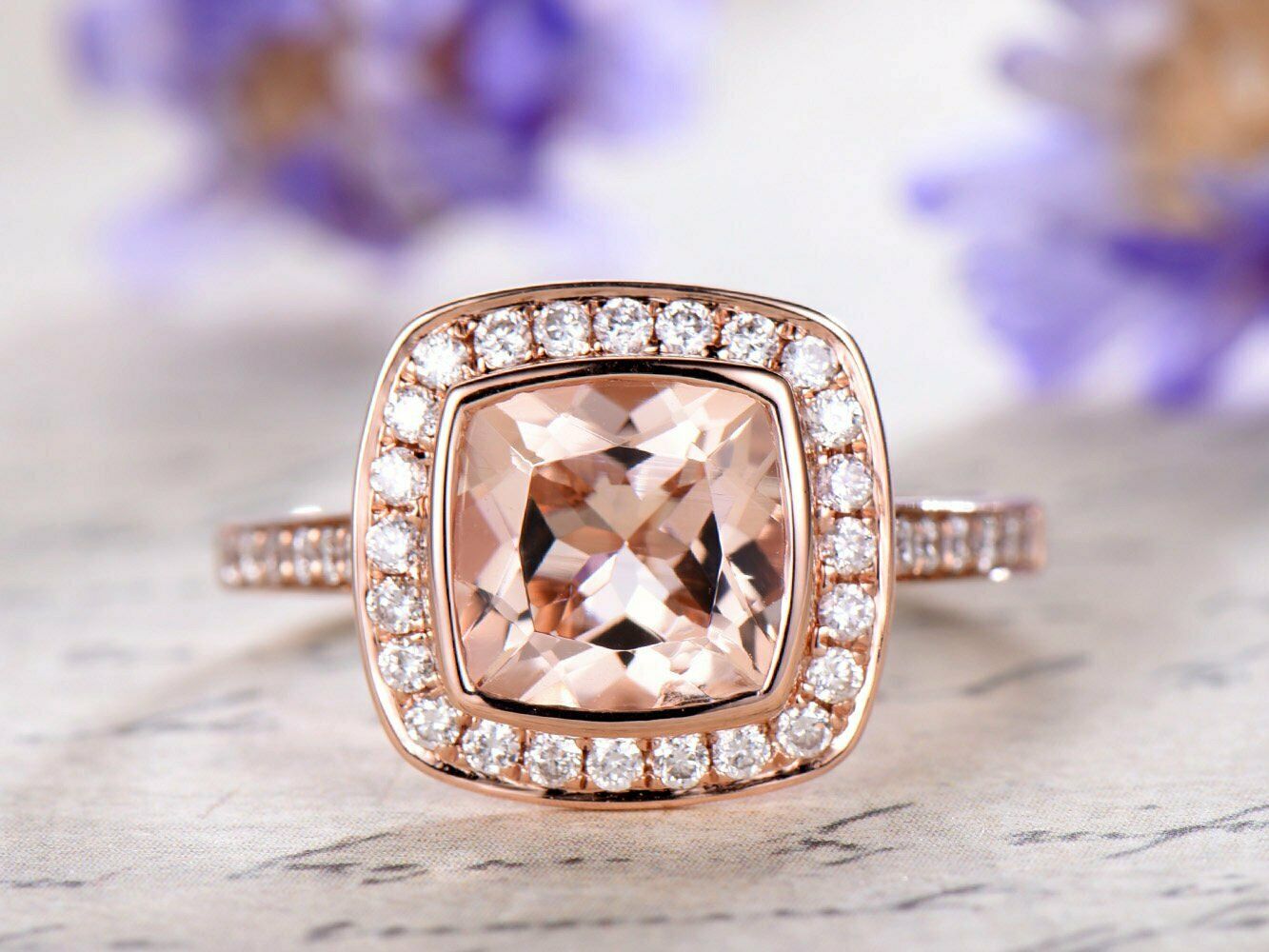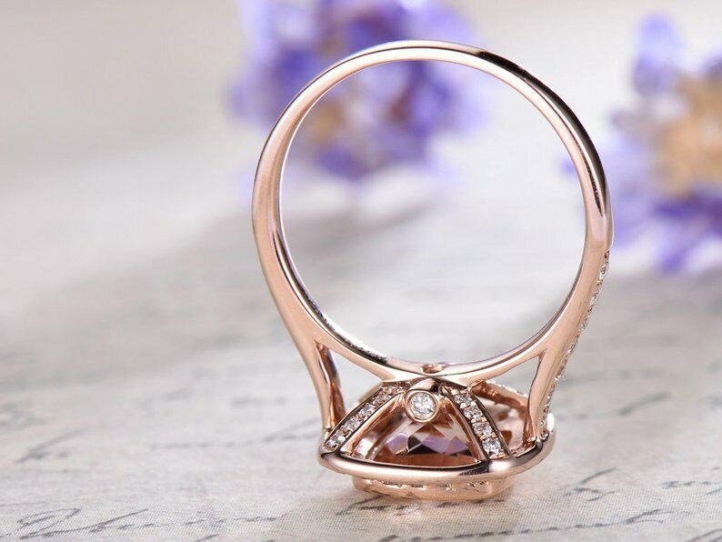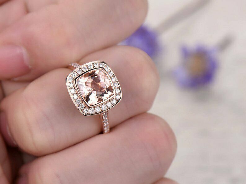 2ct Cushion Cut Peach Morganite Diamond Halo Bezel Set Ring 14k Rose Gold Finish