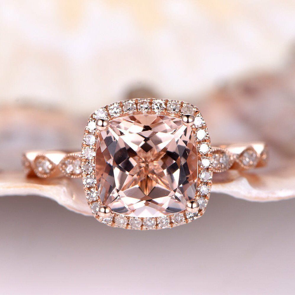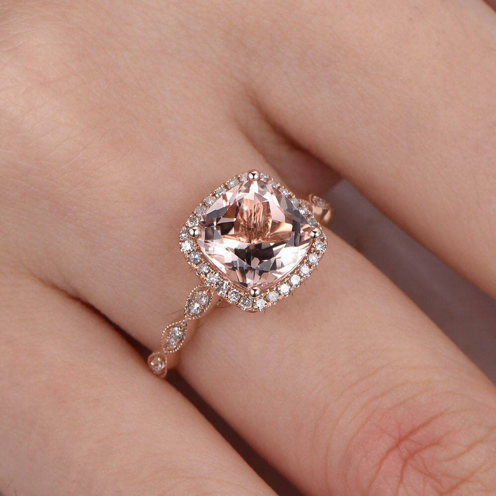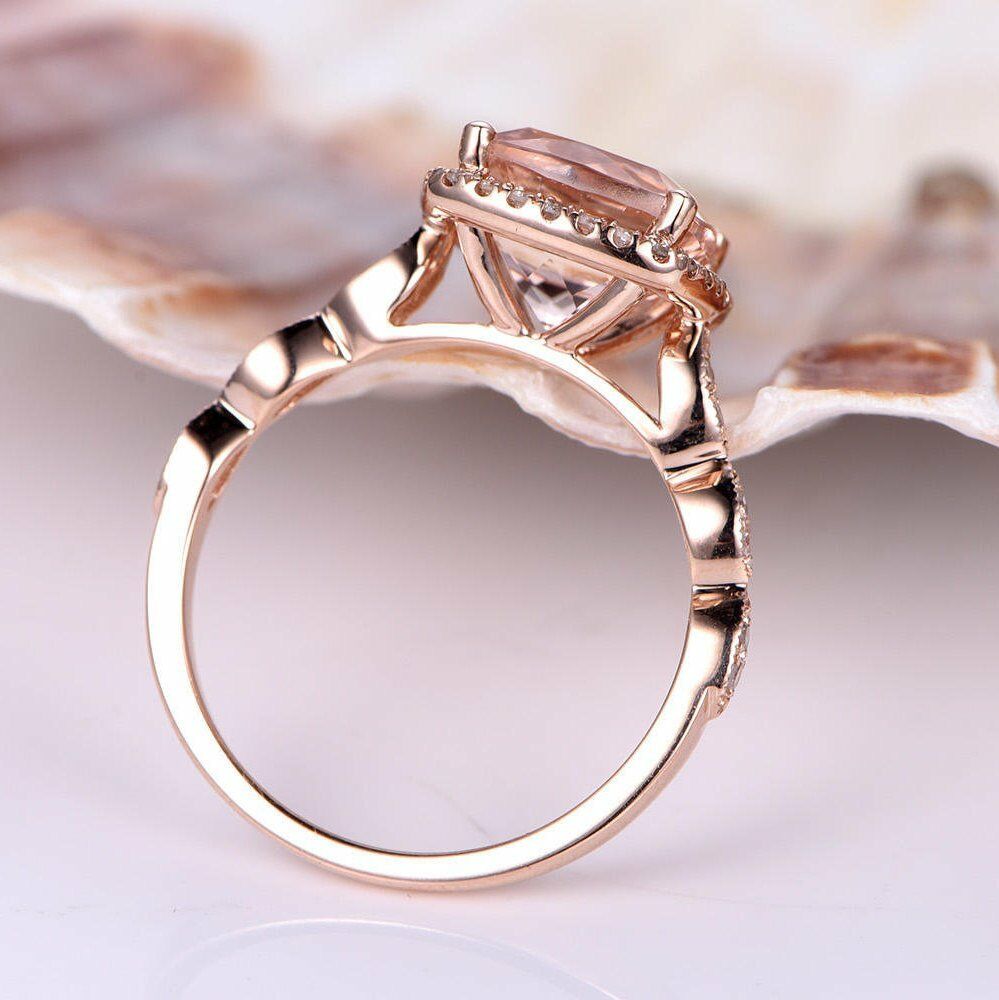 2ct Cushion Cut Peach Morganite Halo Solitaire Engagement Ring 14k RoseGold Over