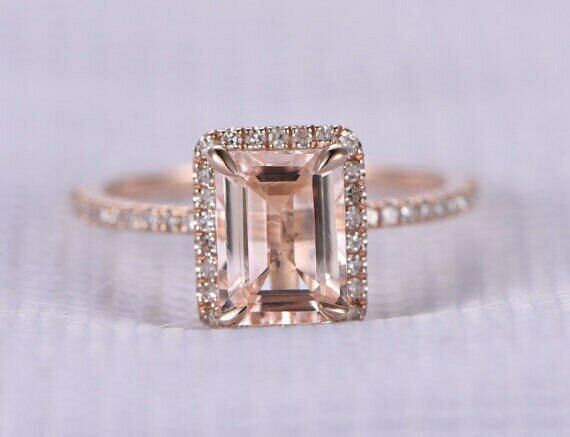 2ct Emerald Cut Morganite Engagement Ring Halo Diamond Accent 14k Rose Gold Over