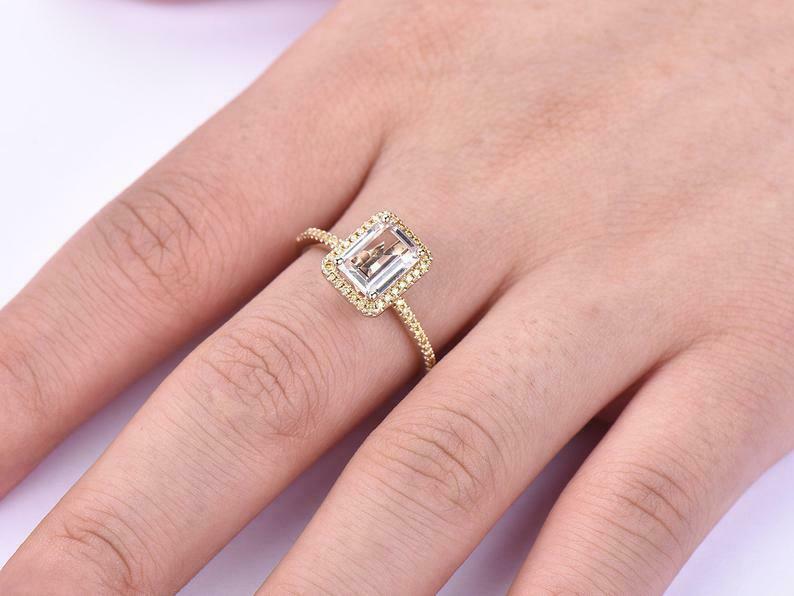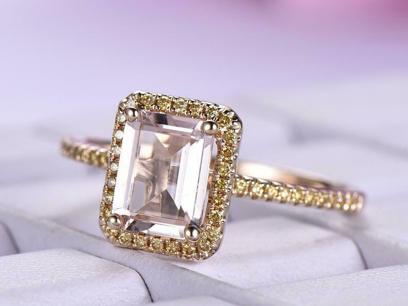 2ct Emerald Cut Morganite Engagement Ring Yellow Sapphire Halo 14k RoseGold Over