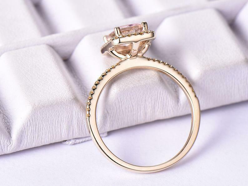 2ct Emerald Cut Peach Morganite Engagement Ring Yellow Sapphire Halo 14k Rose Gold Over