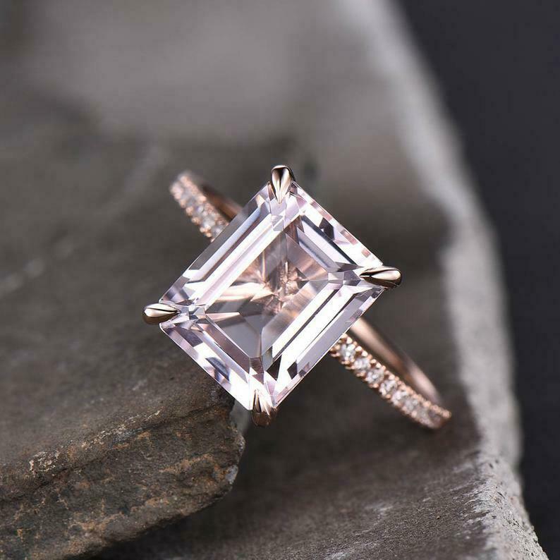 2ct Emerald Cut Peach Morganite Diamond Round Accent Ring 14k Rose Gold Finish
