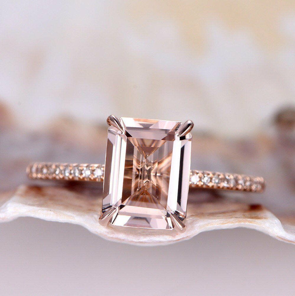 2ct Emerald Cut Peach Morganite Gatsby Halo Engagement Ring 14k Rose Gold Finish