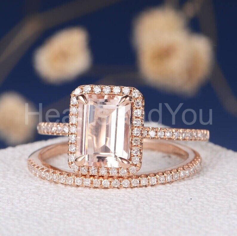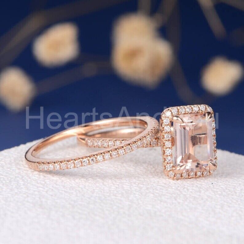 2ct Emerald Cut Simulated Morganite Half Eternity Bridal Set 14k RoseGold Plated