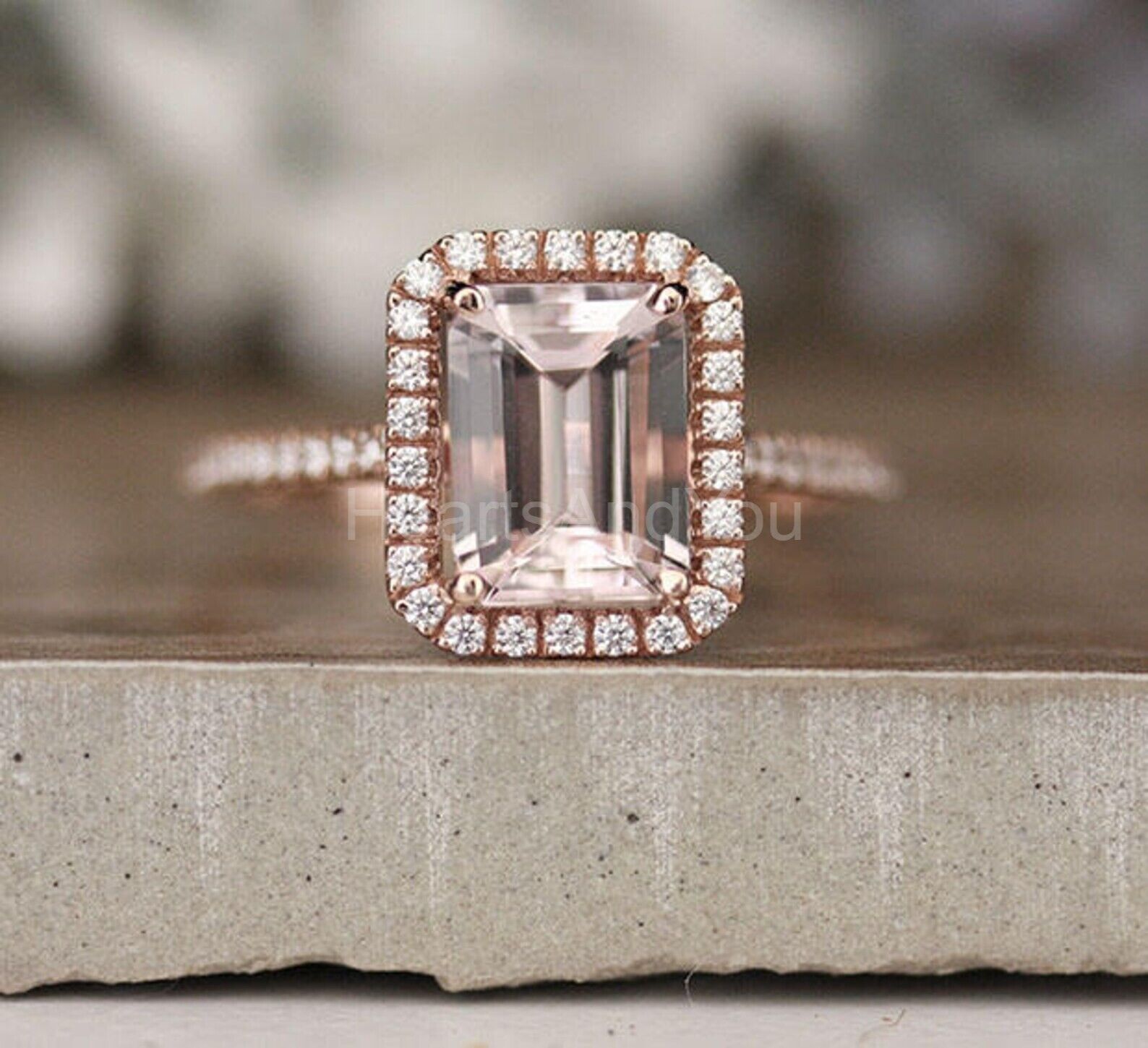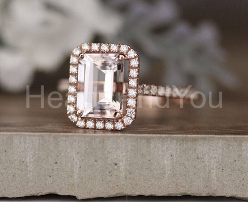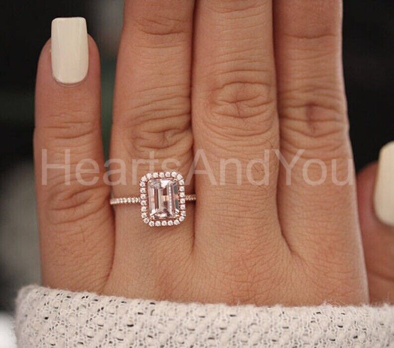2ct Emerald Cut Simulated Morganite Halo Engagement Ring 14k Rose Gold Plated