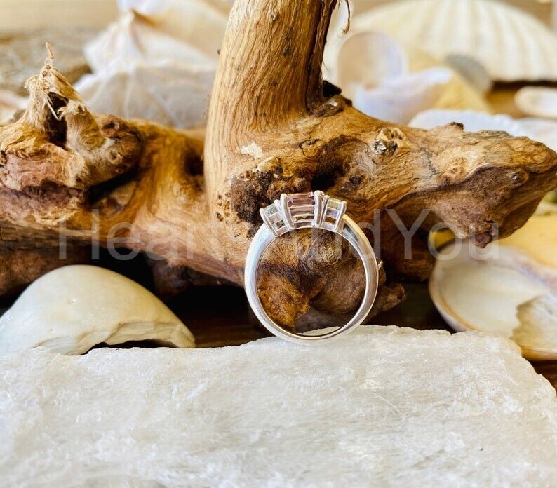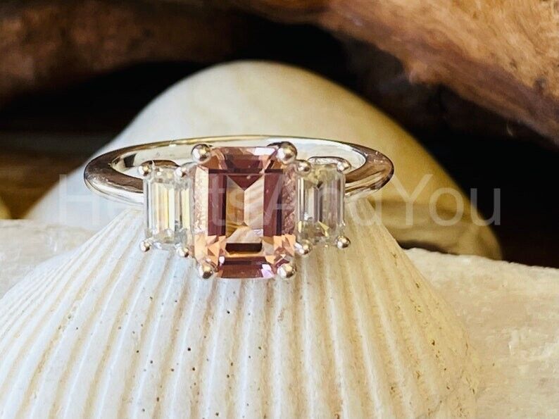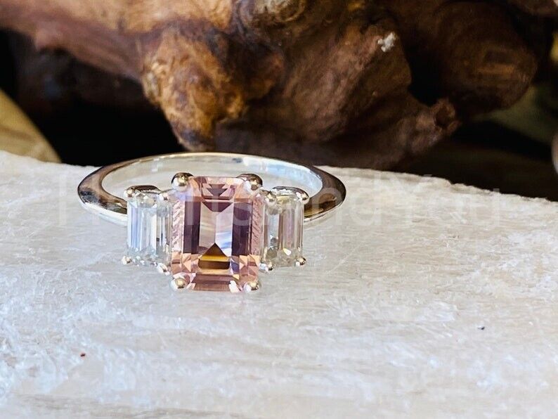 2ct Emerald Cut Simulated Peach Morganite Three Stone Ring 14k White Gold Plated