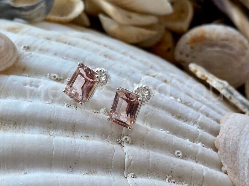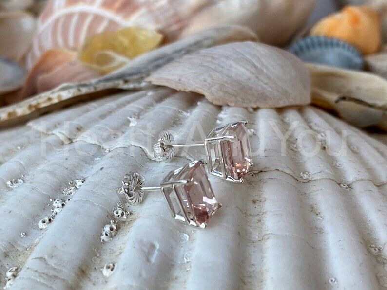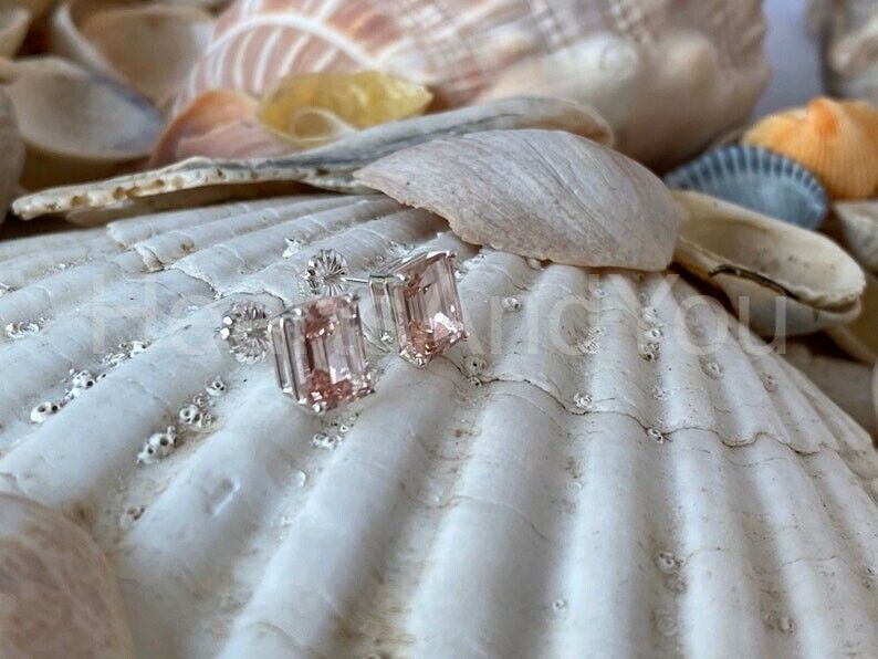 2ct Emerald Cut Simulated Peach Morganite Solitaire Stud Earrings 14k White Gold Plated
