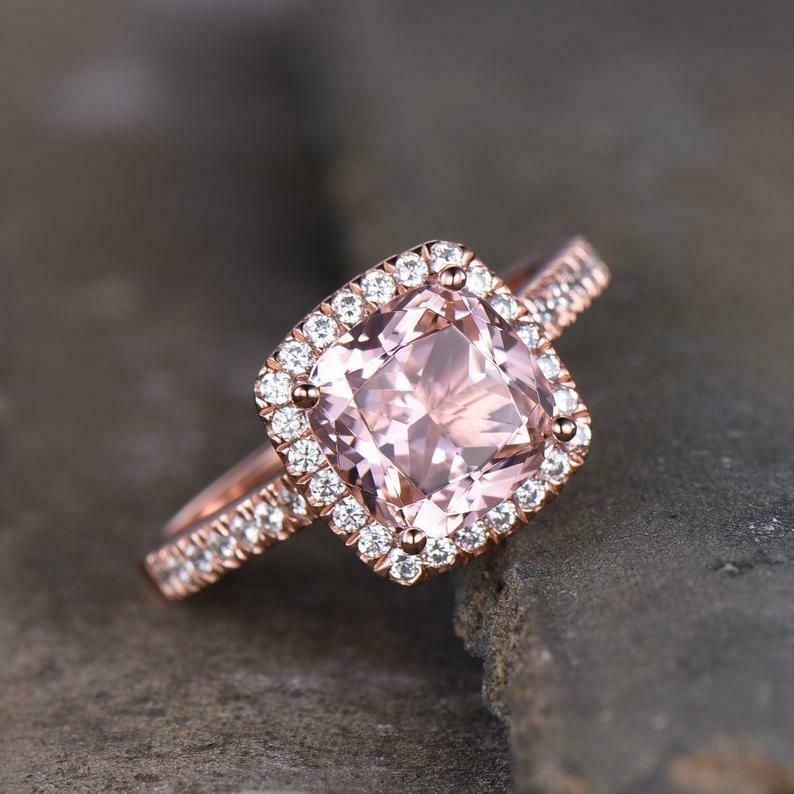 2ct Engagement Ring Cushion Cut Morganite Round Accents Halo 14k Rose Gold Over