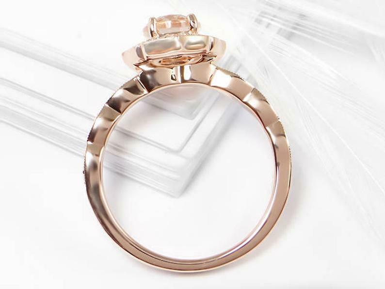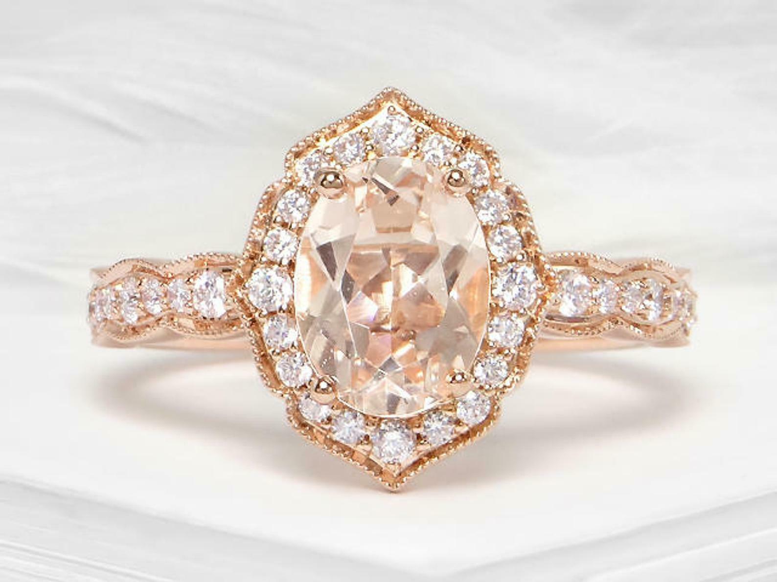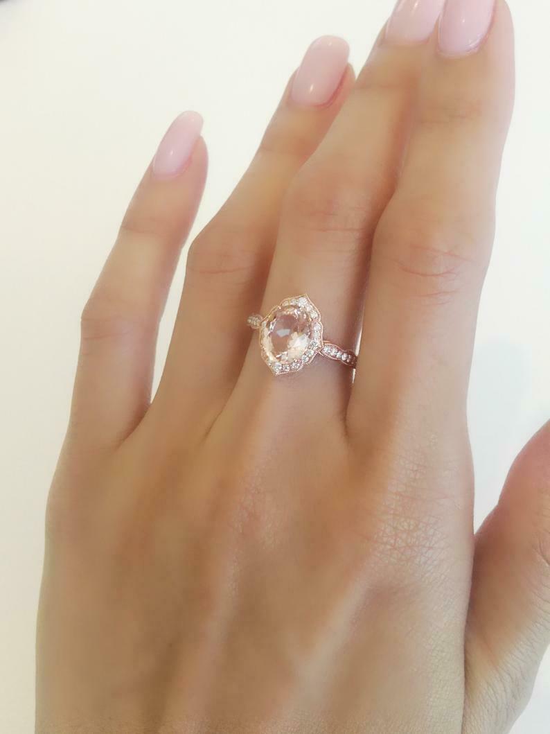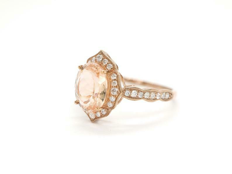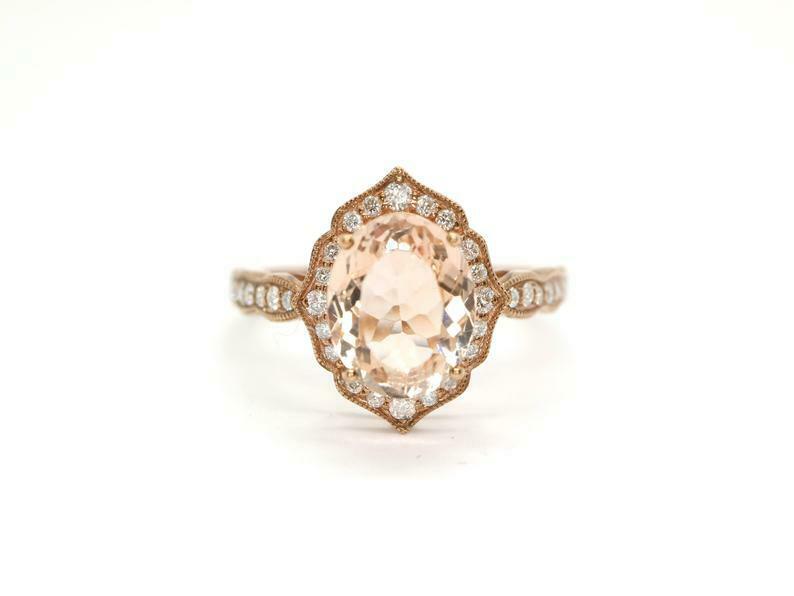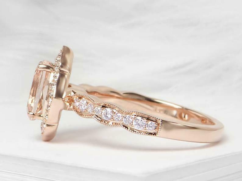 2ct Engagement Ring Oval Cut Peach Morganite Halo Milgrain 14k Rose Gold Finish