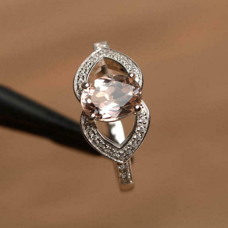 2ct Engagement Ring Oval Cut Peach Morganite Hollow Leaf Halo 14k White Gold Over