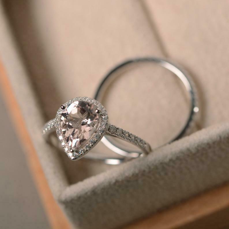 2ct Engagement Ring Pear Cut Peach Morganite Halo Bridal Set 14k White Gold Finish