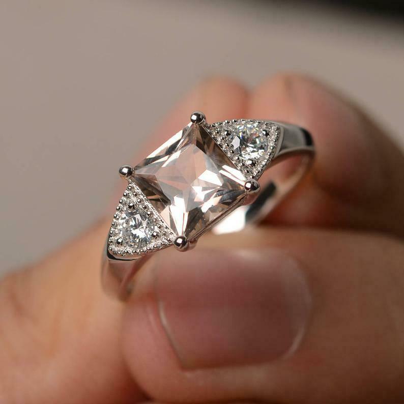 2ct Engagement Ring Princess Cut Morganite Milgrain Trilogy 14k White Gold Over