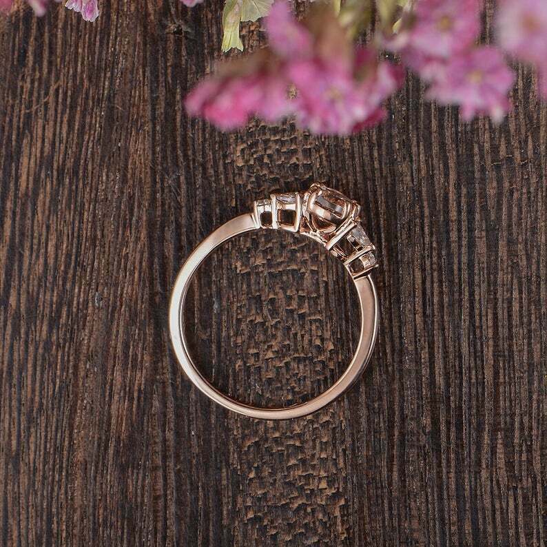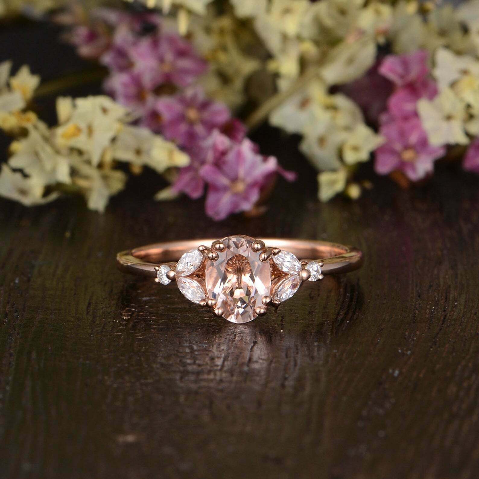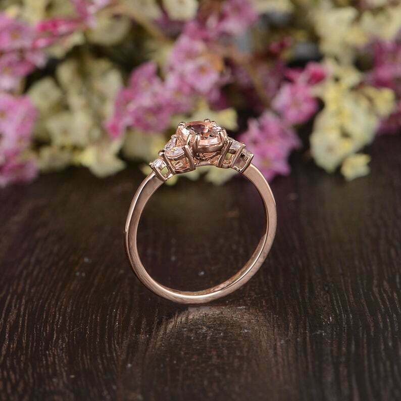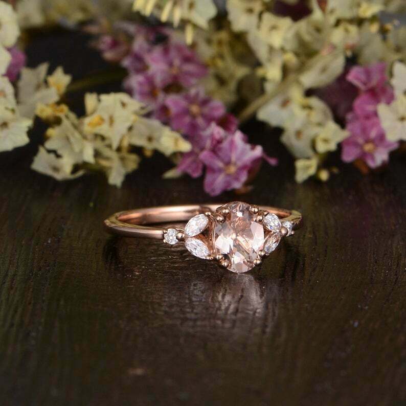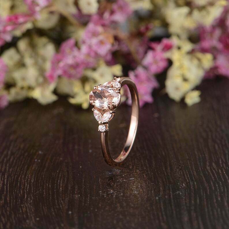 2ct Oval Cut Peach Morganite Leaf Marquise Accent Engagement Ring 14k Rose Gold Finish