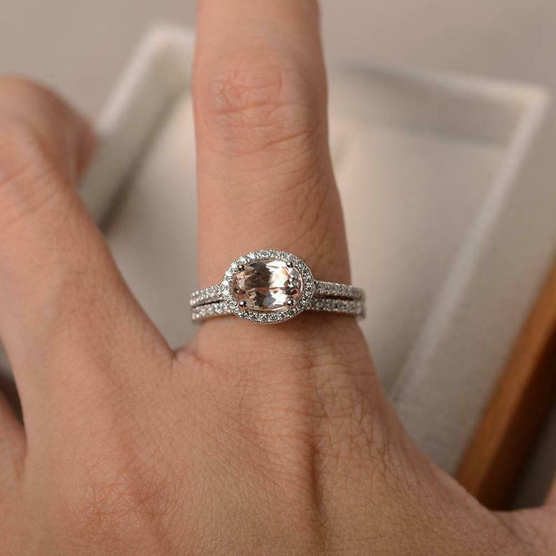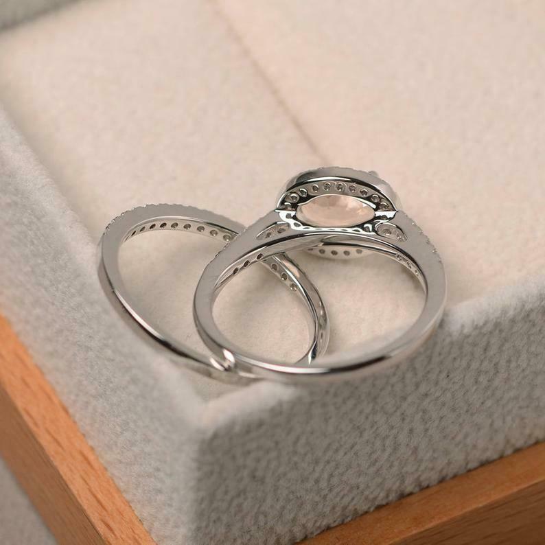 2ct Oval Cut Peach Morganite Engagement Ring Bridal Set Halo 14k White Gold Over