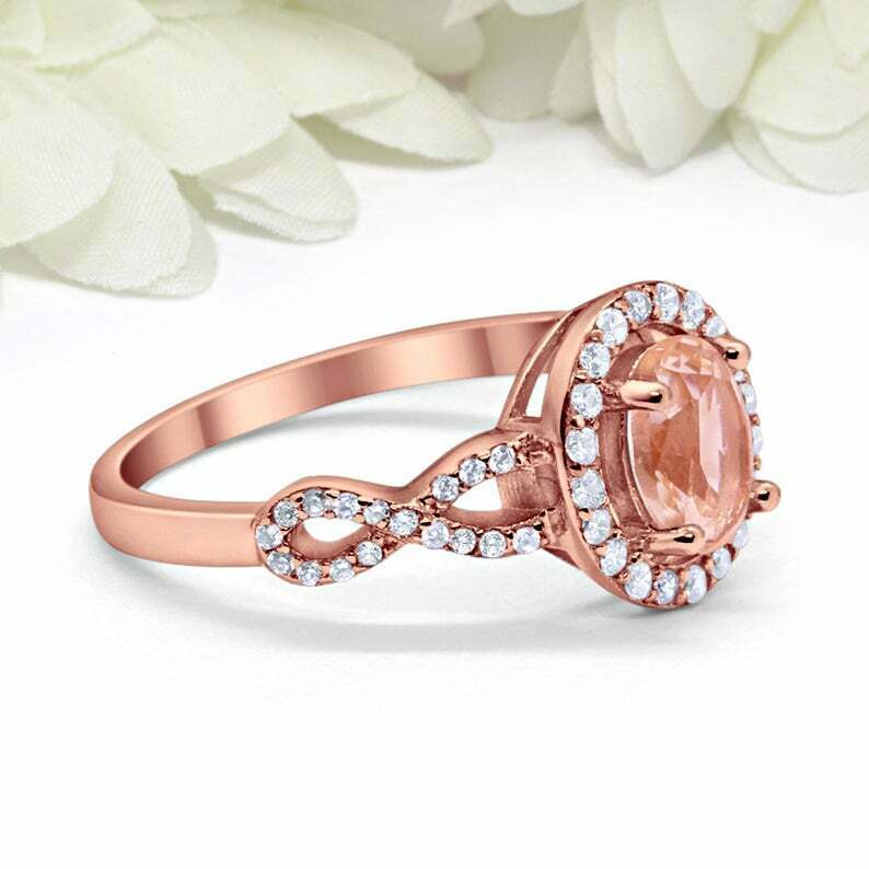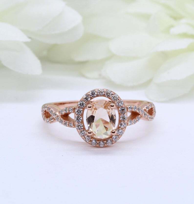 2ct Oval Cut Peach Morganite Engagement Ring Twist Shank Halo 14k Rose Gold Over