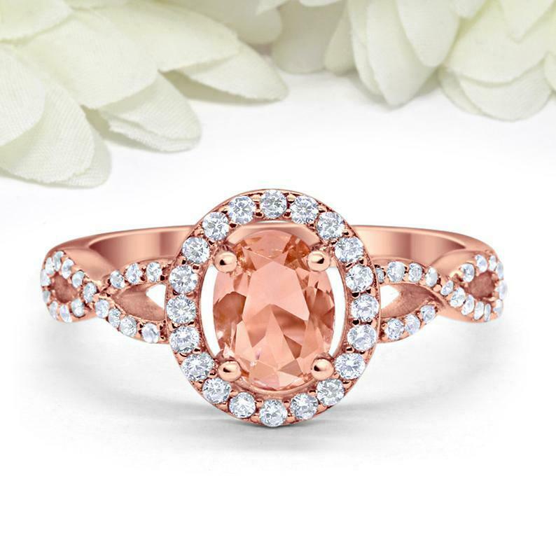 2ct Oval Cut Peach Morganite Engagement Ring Twist Shank Halo 14k Rose Gold Finish