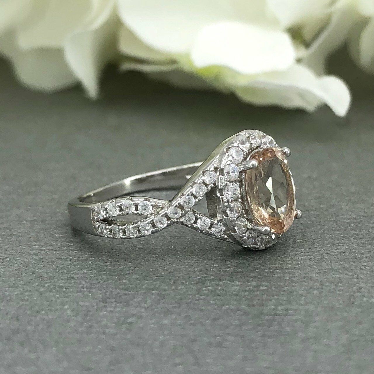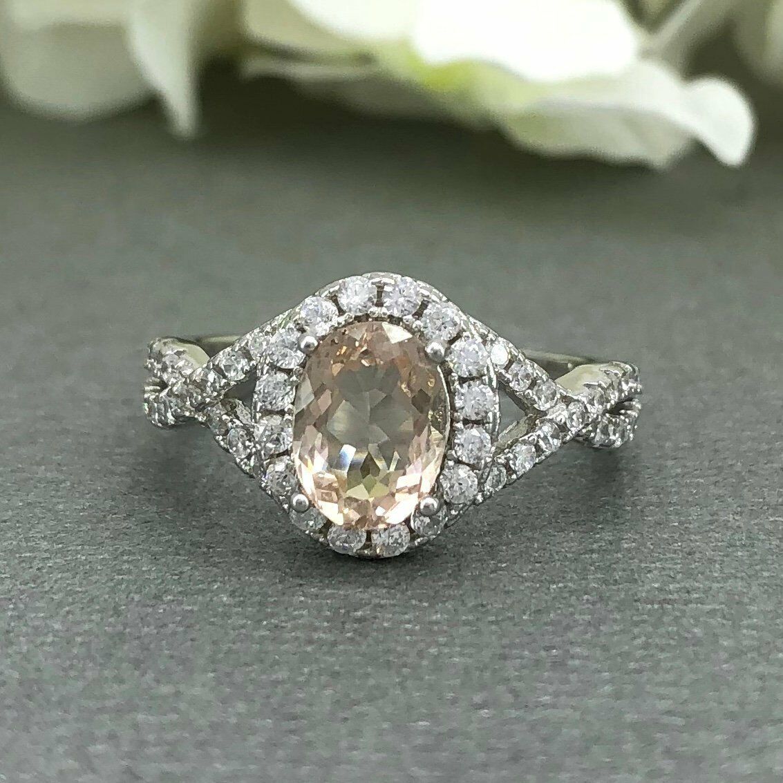 2ct Oval Cut Peach Morganite Halo Infinity Engagement Ring 14k White Gold Finish