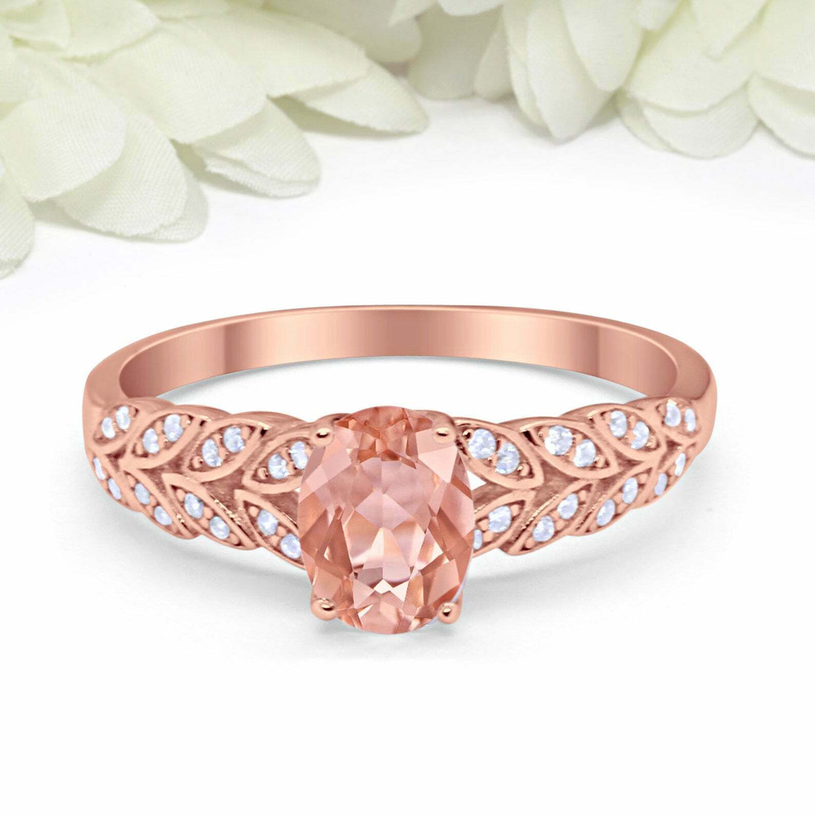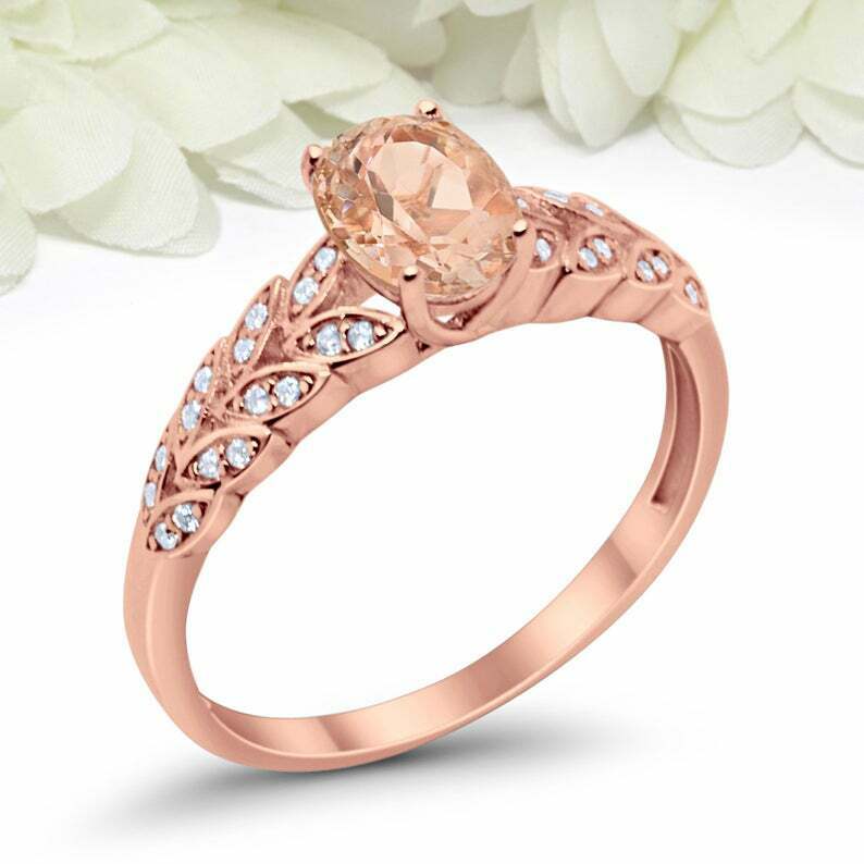 2ct Oval Peach Morganite Engagement Ring Diamond Leaf Accent 14k Rose Gold Over