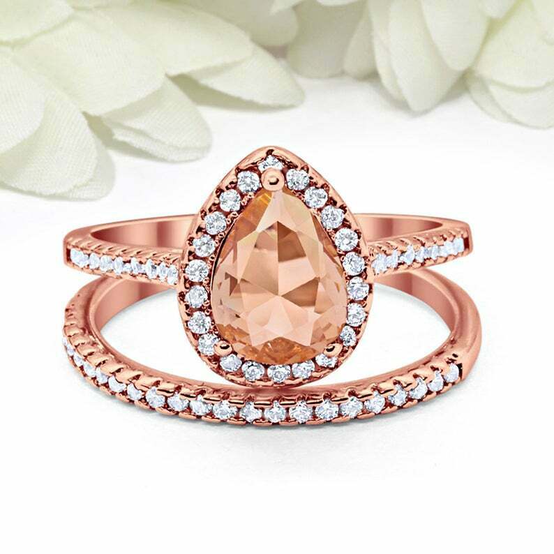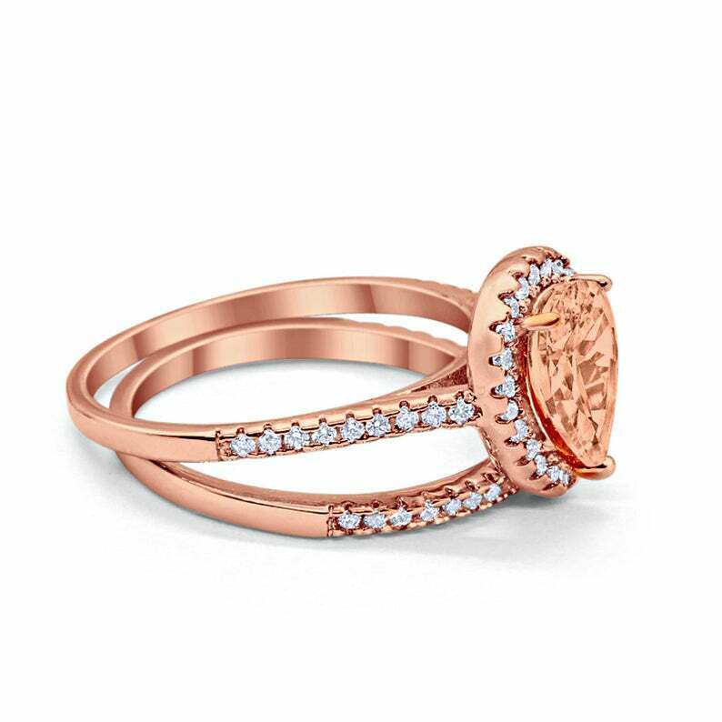 2ct Pear Cut Peach Morganite Engagement Ring Bridal Set Halo 14k RoseGold Finish