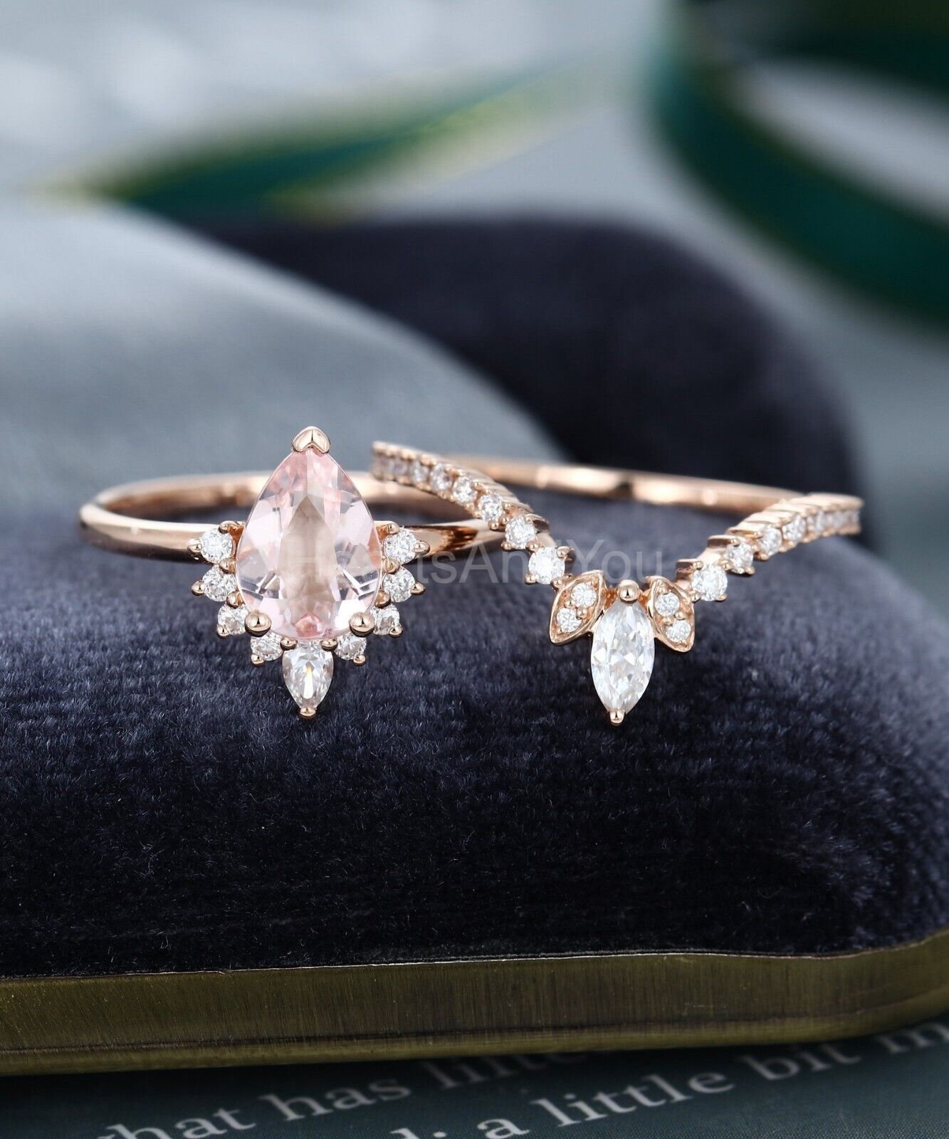 2ct Pear Cut Simulated Morganite Crown Curved Bridal Set 14k Rose Gold Plated
