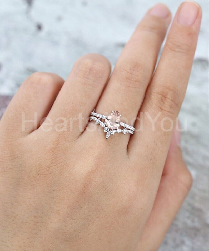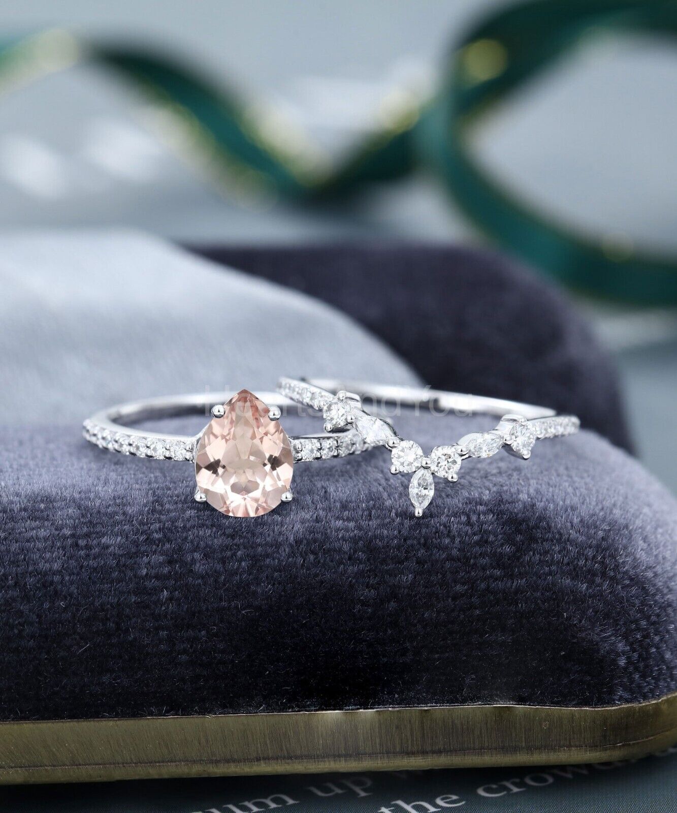 2ct Pear Cut Simulated Peach Morganite Curved Bridal Set 14k White Gold Plated