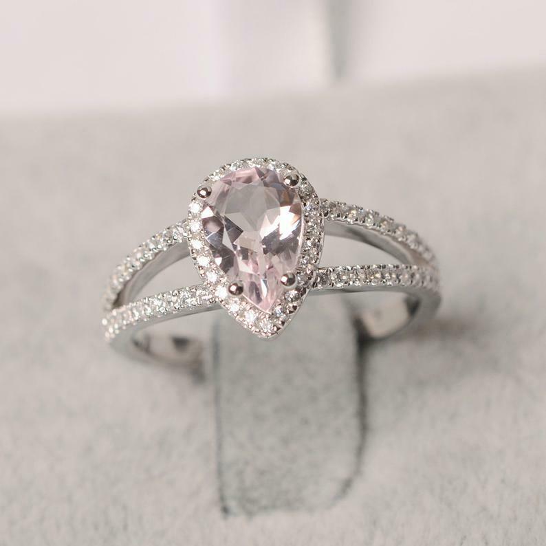 2ct Pear Peach Morganite Engagement Ring Split Shank Halo 14k White Gold Finish
