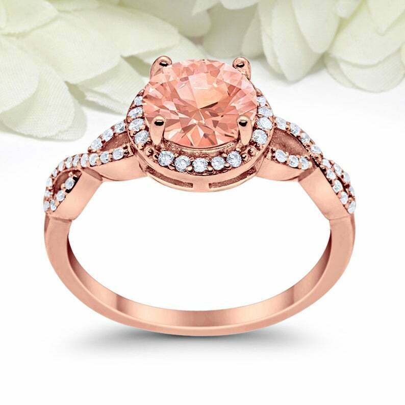 2ct Round Cut Peach Morganite Engagement Ring Twist Shank Halo 14k Rose Gold Over
