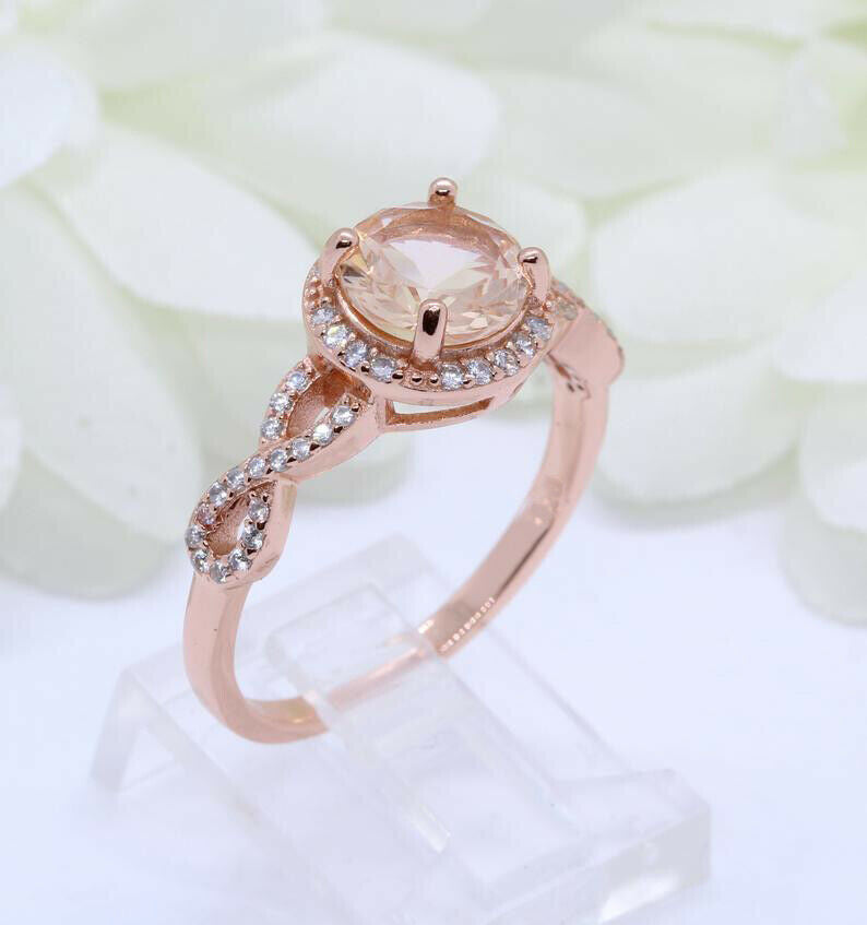 2ct Round Cut Peach Morganite Engagement Ring Twist Shank Halo 14k RoseGold Over