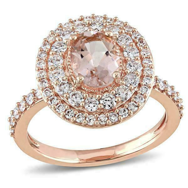 3.5ct Oval Peach Morganite Diamond Dual Halo Engagement Ring 14K RoseGold Over