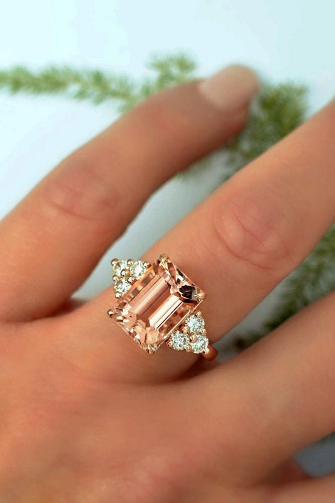 3Ct Emerald Cut Peach Morganite Engagement Ring 18K Rose Gold Over Round Accents