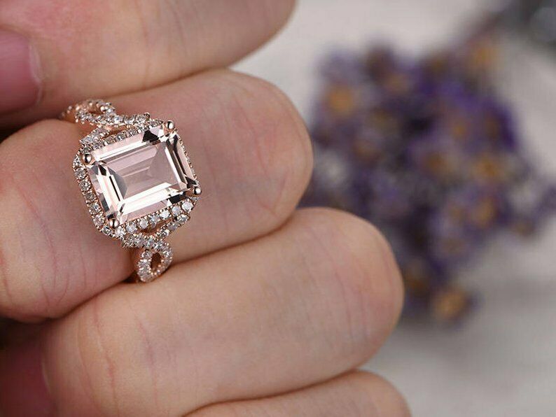 3ct Emerald Cut Peach Morganite Engagement Ring Diamond Halo 14k Rose Gold Finish