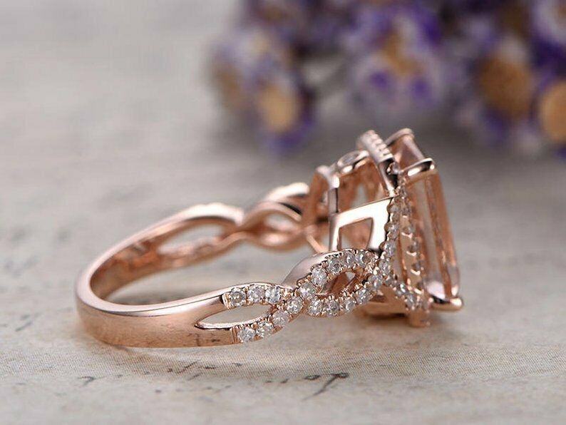 3ct Emerald Cut Peach Morganite Engagement Ring Diamond Halo 14k RoseGold Finish