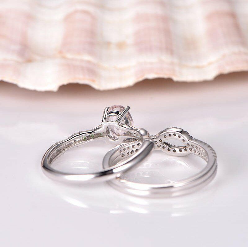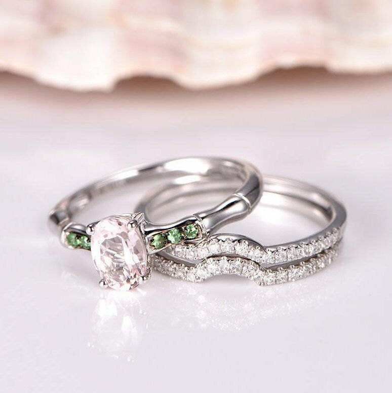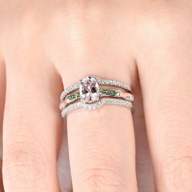 3ct Oval Cut Peach Morganite Trio Set Women Engagement Ring 14k WhiteGold Finish