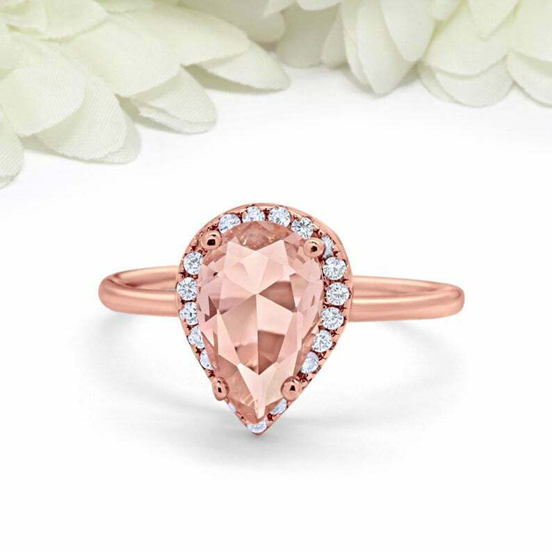 3ct Pear Cut Morganite Engagement Ring Diamond Halo Minimalist 14k RoseGold Over