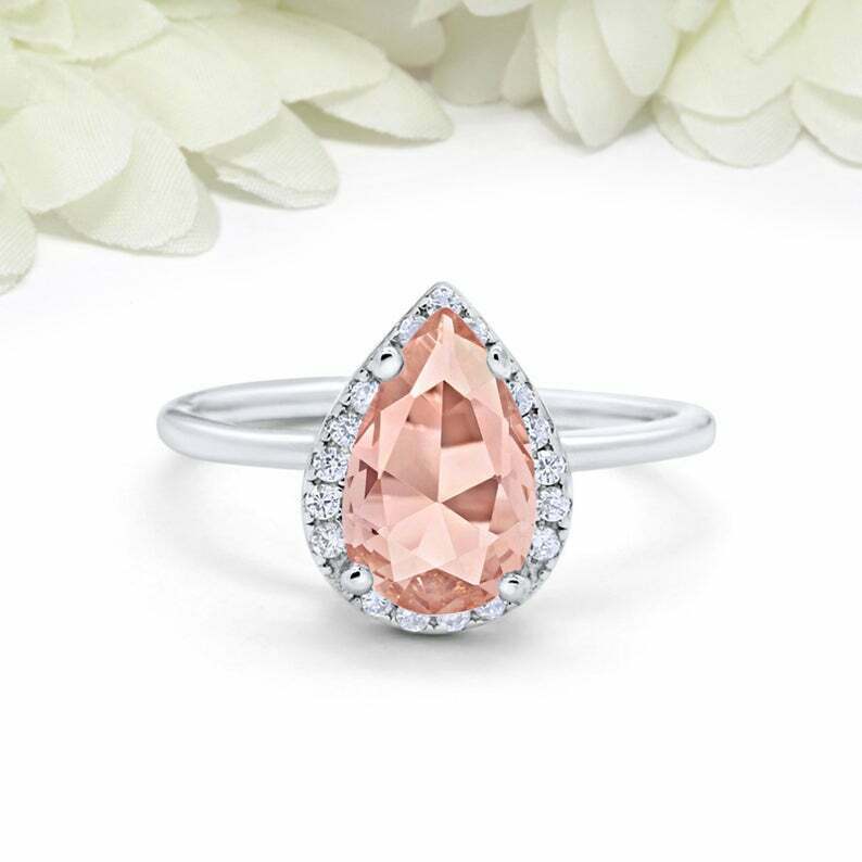 3ct Pear Morganite Engagement Ring Diamond Halo Minimalist 14k White Gold Finish