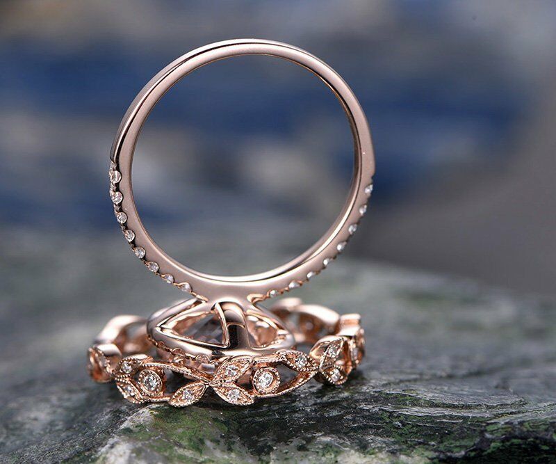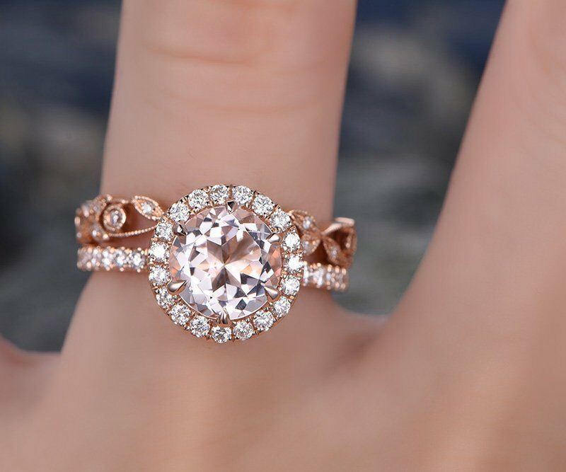 3Ct Round Cut Peach Morganite Stylish Bridal Set Halo Ring 14K Rose Gold Finish